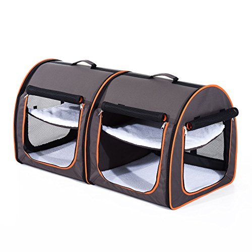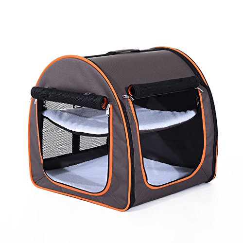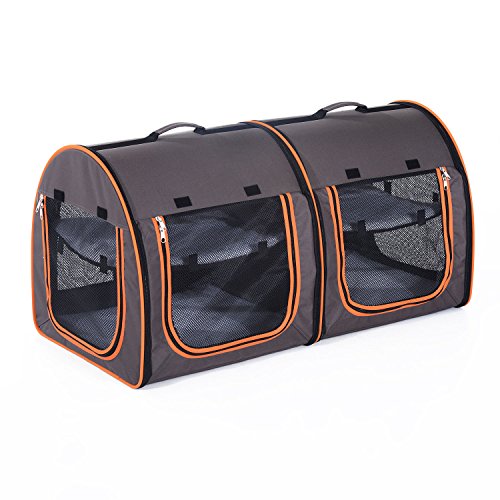 Features: ? Great for indoor/outdoor enjoyment or using as a show shelter ? Ideal for cats and puppies ? 2 hammocks and 2 padded mats are included for extra entertainment and comforts ? Lightweight, compact and portable ? Durable and high quality with oxford material ? 2 pet carriers that combined with zippers ? With carrying handle for easy transportation ? Built-in straps allow safe connection to the car seatbelt ? Cushion and hammock are included (hammock can be removable and washable) ? Easy assembly required