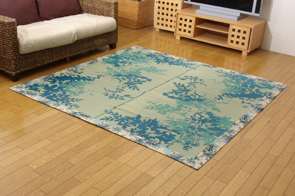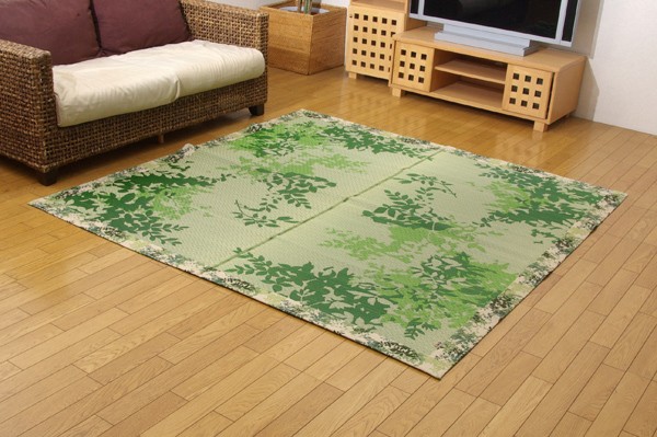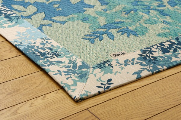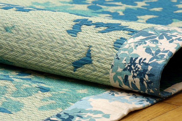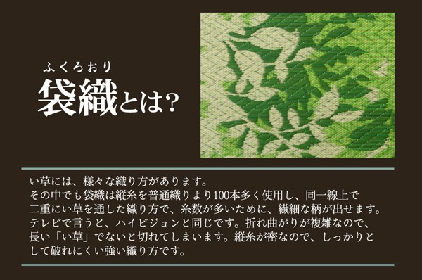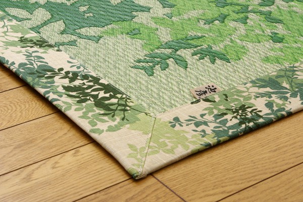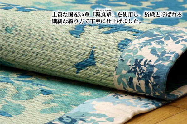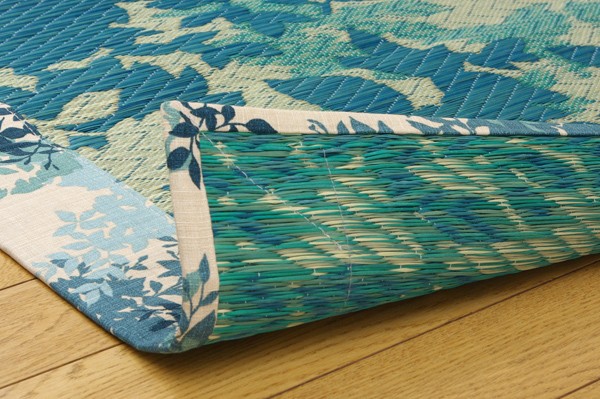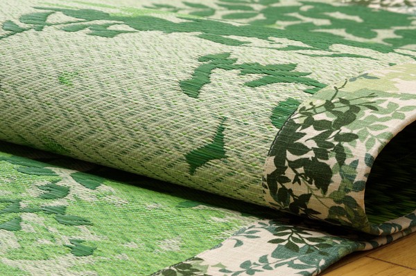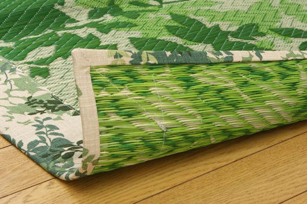 織りが細かく上品なリーフ柄のイ草カーペットです。縦糸の本数が多い袋織りという技法で繊細な柄を出しています。折れ曲がりが複雑なので長いイ草を使用しないと切れてしまいます。縦糸が密なので、しっかりして破れにくいのが特徴です。有機肥料(牛糞、豚糞、稲ワラなどをブレンドしたもの)を使った減農薬栽培の国産(九州産)のい草を使用しています。一般のい草と比べ耐久性や弾力性に優れています。一般のい草と比べて色の褐色が遅く、青さが長く残ります。月日を追うごとに飴色に変化し、より気品が増します。またい草一本一本を手作業で選別し選りすぐられた良いものだけを使用するため味わい深い花莚、すばらしい一品となります。い草には空気の自然浄化作用、湿度の調節作用などがあります。また汚れにくく、使用するうちに黄金色に変化し味が出ます。い草に青森ヒバ加工を施しています。(抗菌、防臭効果)