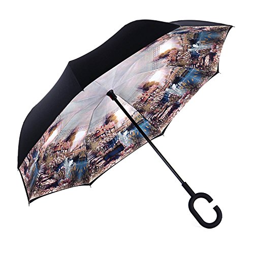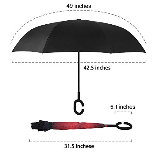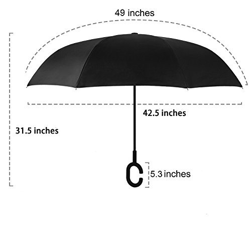 -. Feature : ☂DOUBLE PROTECTION☂ - UPF>50+ Sunscreen Windproof and UV proof, Inverted Reverse umbrella, Light transmittance is "0".Protect you from wind and rain or sun at anytime. / ☂ Durable Materials ☂: Made of water repellent pongee fabric, breathable double layer canopy and smooth top, using high-quality steel shaft and premium resin-reinforced fiberglass ribs.Transformed into eight legs upon contracting the umbrella, can stand up on its own when closed, and be convenient for you to place anywhere. / ☂ Inside-Out Folding ☂: Innovative design allows you to close it in an inverted/reverse direction, which means the outside layer will become the inside layer after closing, so you can put it directly anywhere in a car or a room without making the seat or floor wet, and even other people standing beside you on a bus or the subway will not get wet. / ☂ Hands Free Handle ☂: - Great for phone user and mothers, Cross the C-shape handle over your arm, made you hands free for holding a baby, bag or mobile if needed. / ☂Ideal Gift & Quality Guarantee☂: This car reverse umbrella is perfect for your car; it's also a creative gift for your parents, friends, colleagues and etc. Using this reverse umbrella, you are always protected from rain, wind and UV. If anything goes wrong with your umbrella, we will send you a replacement absolutely free, no return required.