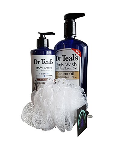 Dr Teal’s Coconut Body Wash and Lotion Bundle with Flowing Stones Pouf Loofah Sponge
