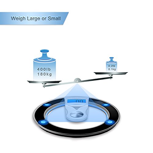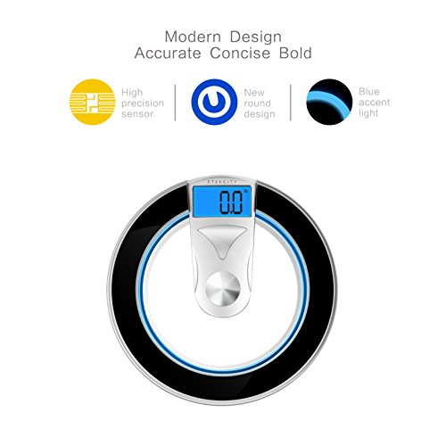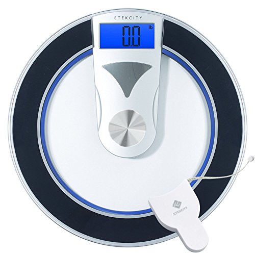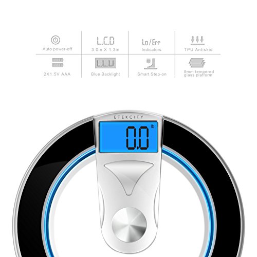-. Binding : Health and Beauty -. Brand : Etekcity -. Color : Black -. Department : unisex-adult -. EAN : 0679113376892 -. Feature : Step and Read: Get immediate readings as soon as you step on the scale; Reading Lock Function keeps results on the digital display even after you step of the scale / HIGHLY ACCURATE: 4 - Latest version high-precision sensors; Step on the platform and read out the results on an extra large 3" backlit display; Available results in pounds and kilograms with a capacity of 400 lb / 180 kg with increments of 0.2 lb / 0.1 kg / TEMPERED DURABILITY: Thick and resilient 8mm tempered glass platform provides exceptional sturdiness to health and fitness tracking. / A contemporary circular glass platform and stylish electric blue illumination was designed for someone looking to add a touch of sophistication and class to their home. / Auto-power off, auto-zero, Low battery and overload indication; 2 AAA batteries included. Meet CE/ROHS certification. 1 Year Warranty by Etekcity -. IsAdultProduct : 0 -. Label : Etekcity -. Manufacturer : Etekcity -. Model : Does Not Apply -. MPN : 679113376892 -. PackageQuantity : 1 -. PartNumber : 679113376892 -. ProductGroup : Health and Beauty -. ProductTypeName : HEALTH_PERSONAL_CARE -. Publisher : Etekcity -. Size : Body Weight Scale (Circular Design) -. Studio : Etekcity -. Title : Etekcity Digital Weight Bathroom Scale with Body Tape Measure Curvy Sleek Design, 400 Pounds -. UPC : 679113376892