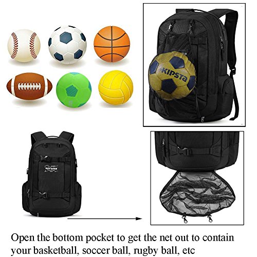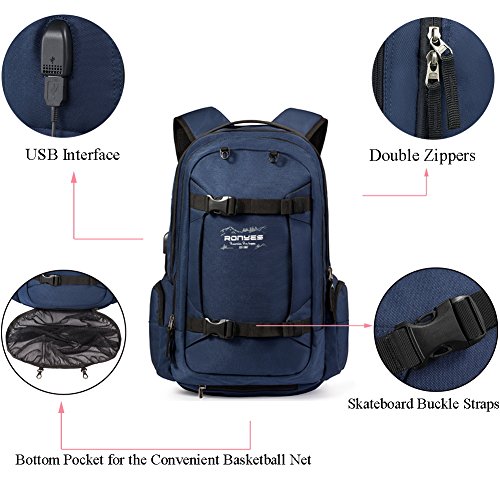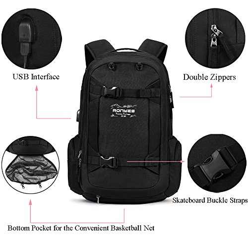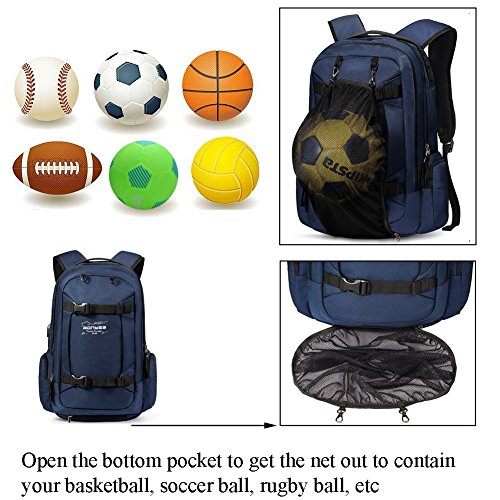 Useful Features The basketball net can holds basketball, Baseball, football, soccer ball which is very convenient to free your hands; Ergonomic design with S-shaped Shoulder Straps, which well alleviate your fatigue; External USB with built-in charging cable offers a convenient charging; Padded breathable air mesh shoulder straps and comfortable back padding relieve the pressure of your shoulders; Adjustable buckle waist belt and buckle sternum strap offer you a great comfort.