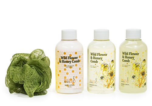 Luxury Wild Flower and Honey Comb Spa Gift Set: Aromatic Bathroom Spa Features Shower Gel, Bubble Bath, Body Lotion, and a Bath Puff