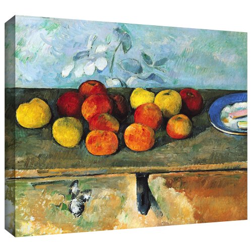 Paul Cezanne 'Still Life of Apples and Biscuits' gallery-wrapped canvas is a high-quality canvas print depicting fruit laid out on a chest. Shapes and their shadows are deliberately flattened and reduced to brush strokes of color. Paul Cezanne was a French Post-Impressionist painter. Cezanne formed the bridge between late 19th-century Impressionism and early 20th century Cubism. Cezanne's often repetitive, exploratory brushstrokes are highly characteristic and clearly recognizable. He used planes of color and small brushstrokes that build up to form complex fields. The paintings convey Cezanne's intense study of his subjects.Feature