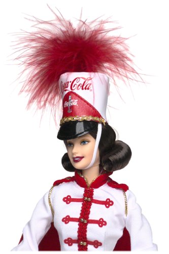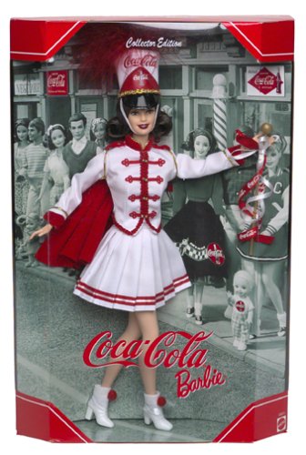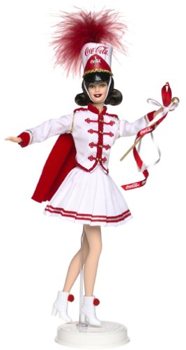 - Includes: Barbie Doll approx. 11.5" tall w/brunette hair & blue eyes. Doll wears a white Majorette Outfit with red & gold trim, white Boots, & a Coca Cola on her Hat. Comes with a Mace with red Coca Cola & white ribbons.