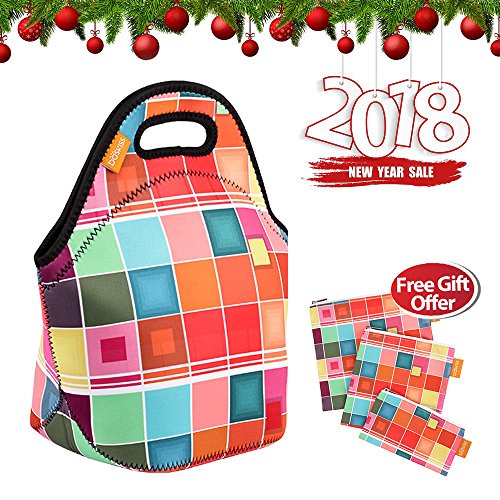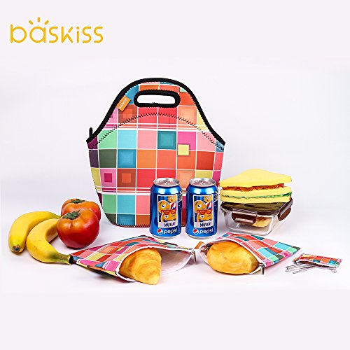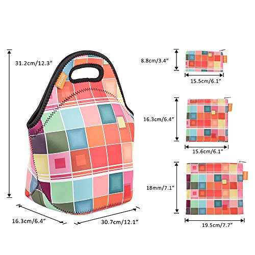 [4 Set] Neoprene Lunch Bag and Reusable Sandwich & Snack Baggies, Machine Washable, Reusable Lunch Tote Set for Travel, Picnic, Office, School (Color Square)