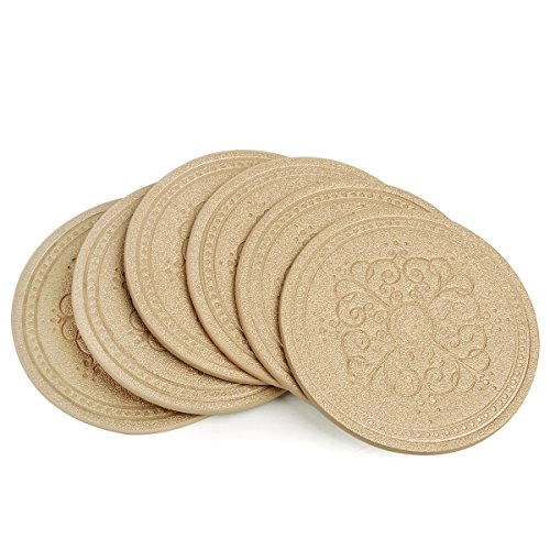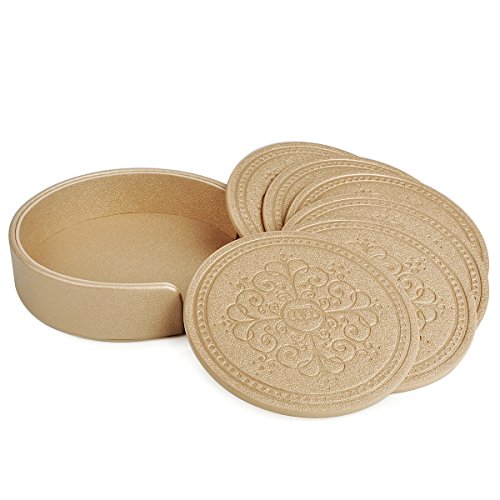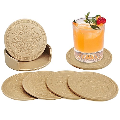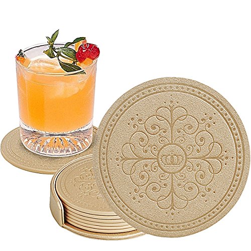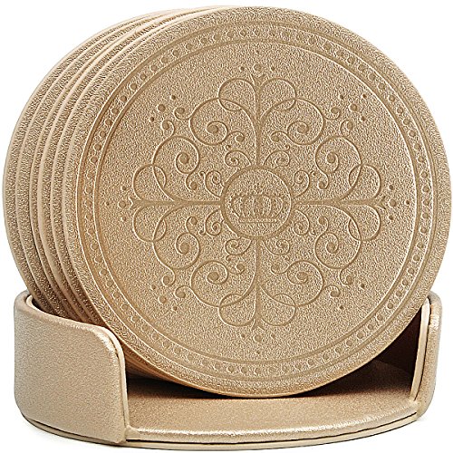 Drinks Coasters,Classic Pattern Faux Leather Coaster Set of 6 with Holder Absorbent Coasters by Happydavid (gold round)