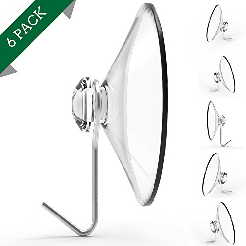 Suction Cup Hooks, Set of 6, 2" Clear Heavy Duty Cups W/ Stainless Hook, Best for Shower, Bathroom, Kitchen, & Windows - Super Strong Pads Makes Them Perfect For Outdoor Use On Wreaths & Bird Feeders
