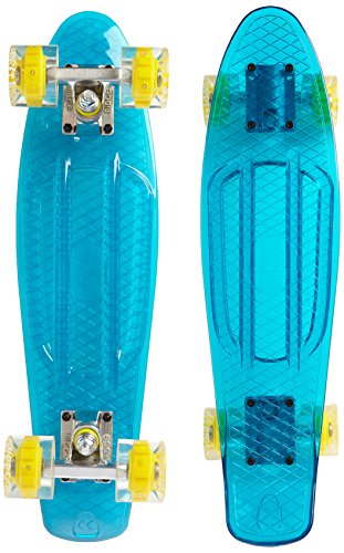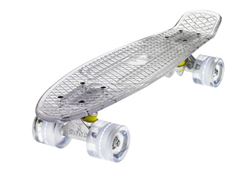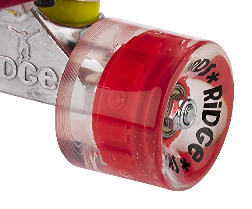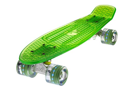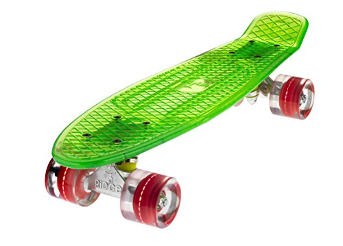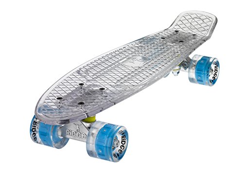Mit einem Deck aus kristall-klaren Polycarbonat, und Rollen die super-hell die Nacht aufleuchten, der Ridge Blaze Mini Cruiser ist ein High-Tech Sache der Schönheit. Unter den Füßen sieht man Tag und Nacht die Erde wegrasen, und im Dunkeln kann man richtig angeben, den dann ist das ganze Teil vom Rollen noch farbig aufgeleuchtet: Ihren persönlichen Lightshow! Jede klare PU Rolle enthält mehrere starke LED Glühbirne, die mit der Drehung auferleuchtet werden- d.h keine Batterien erforderlich.Feature