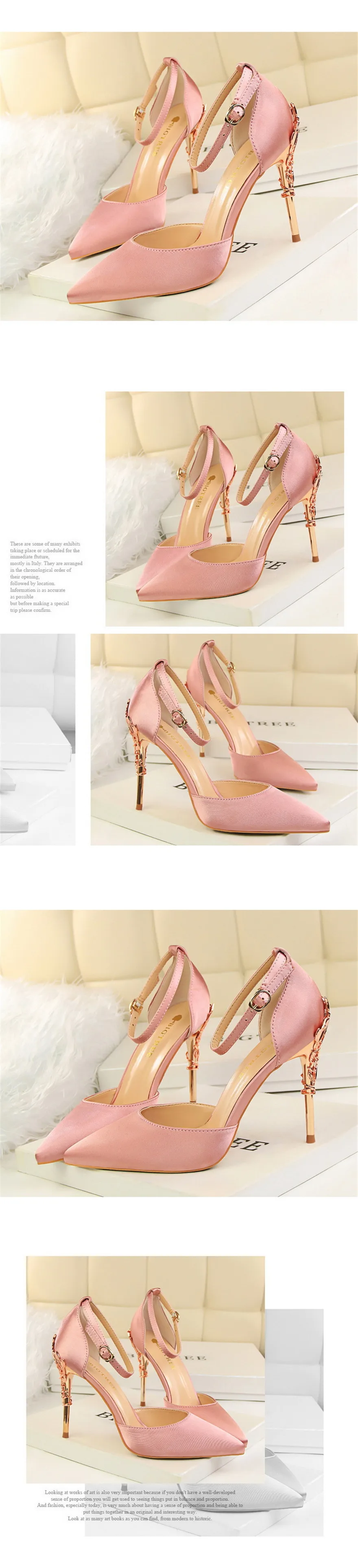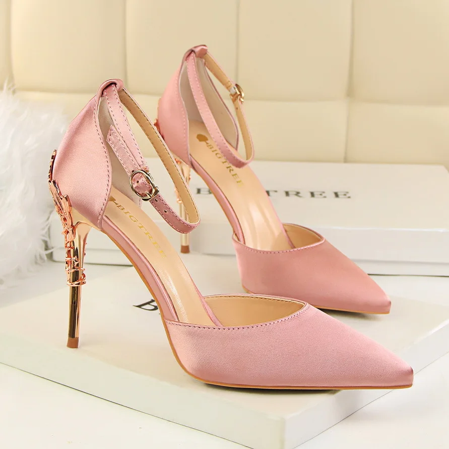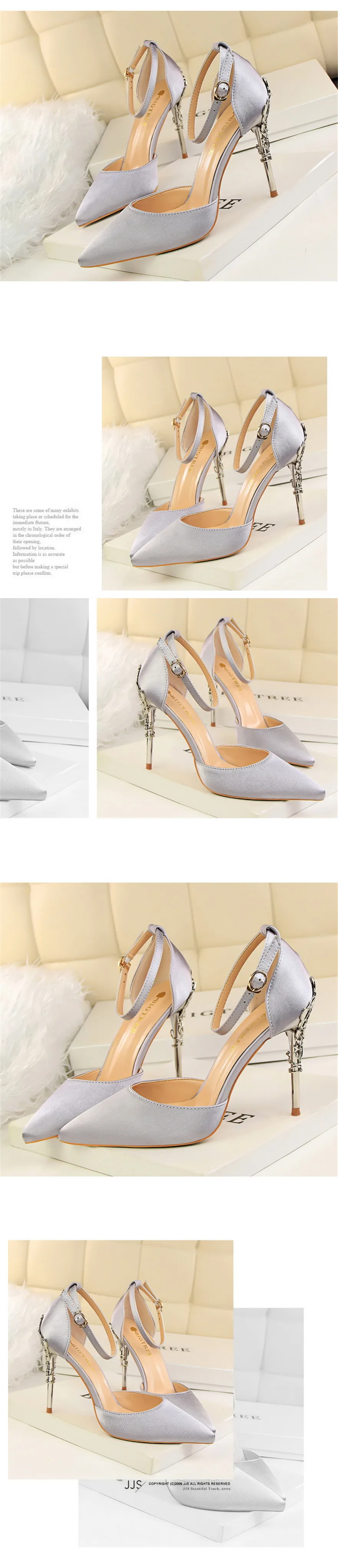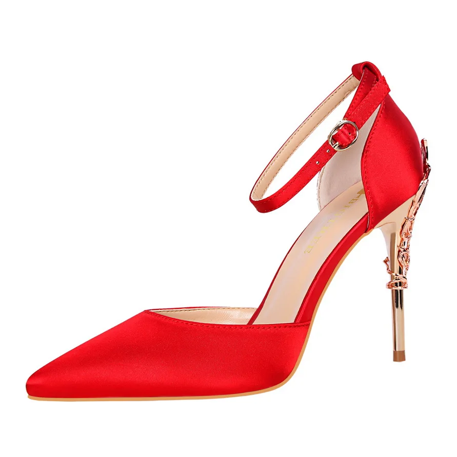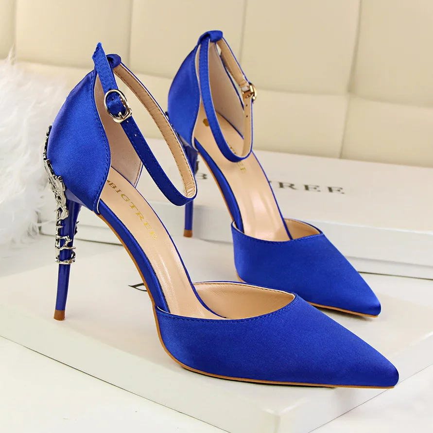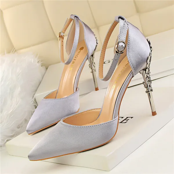 Item:Solid Silk Pointed Toe Buckle Shallow Women Carved Metal Heels Sandals