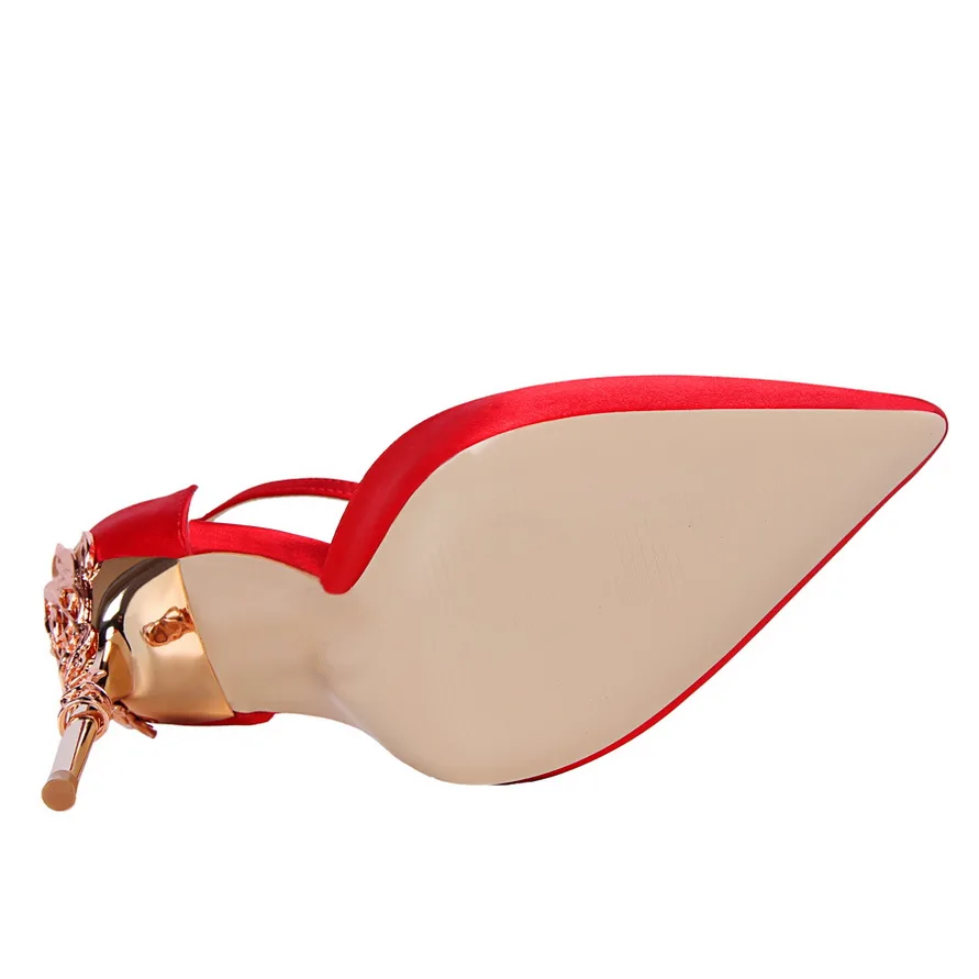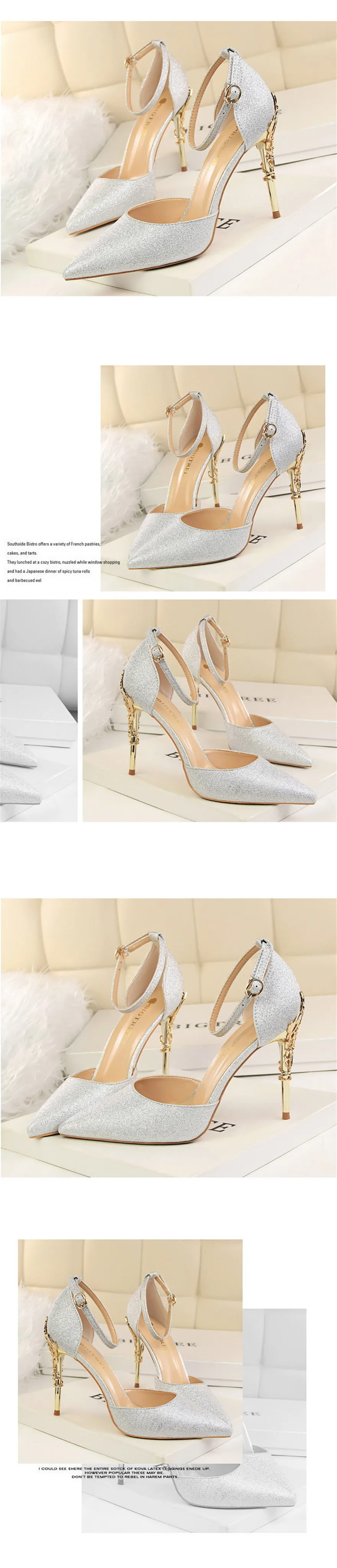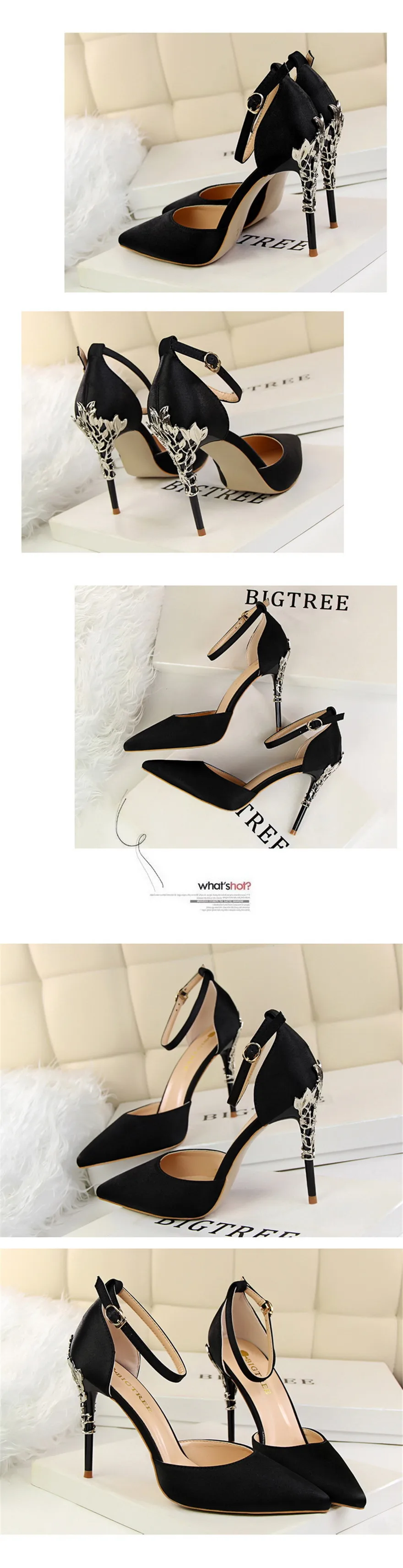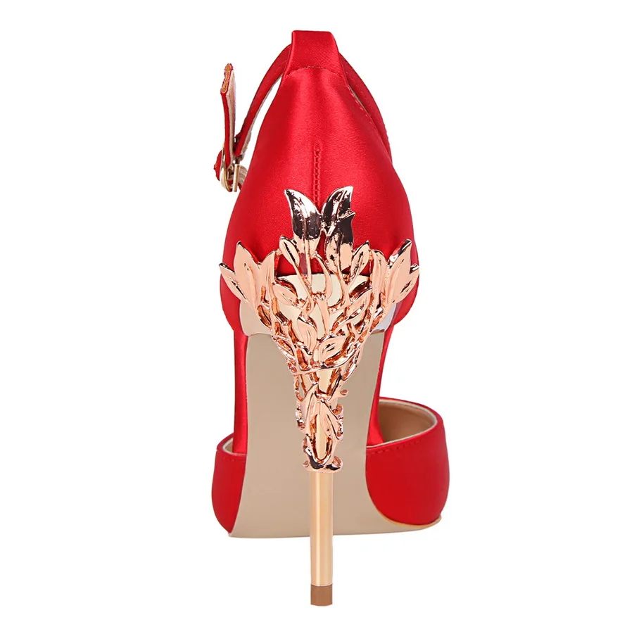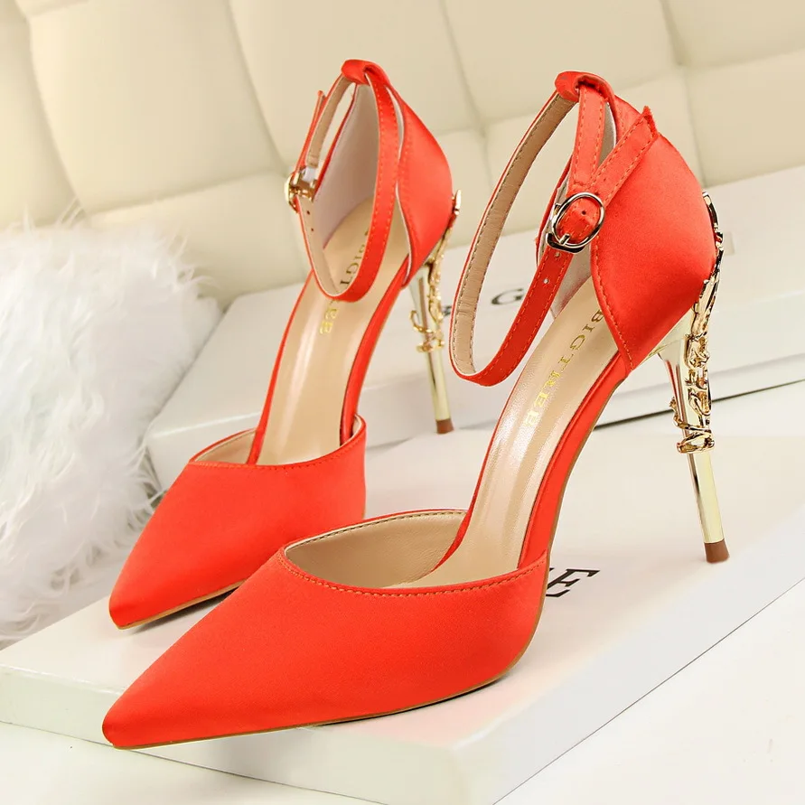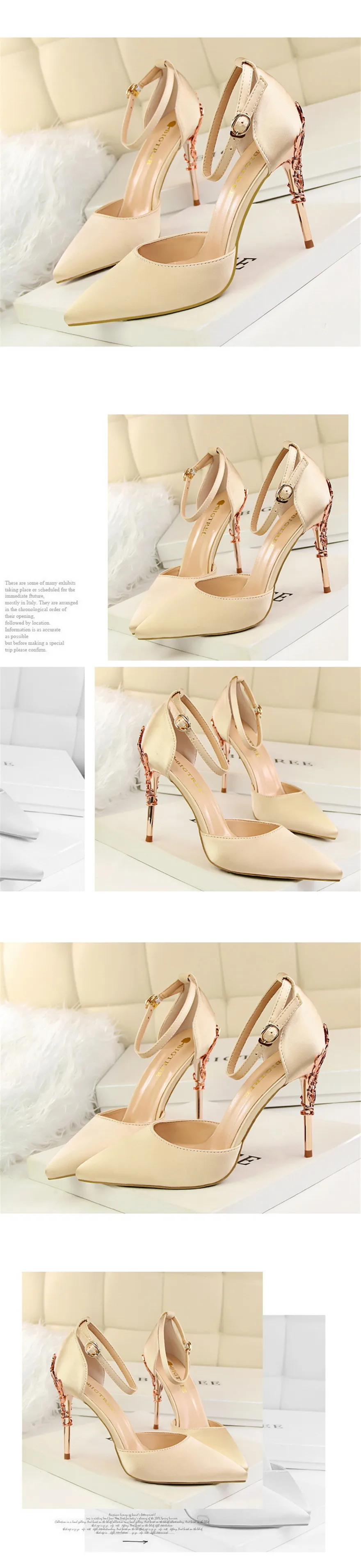 Item:Solid Silk Pointed Toe Buckle Shallow Women Carved Metal Heels Sandals