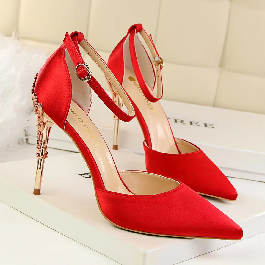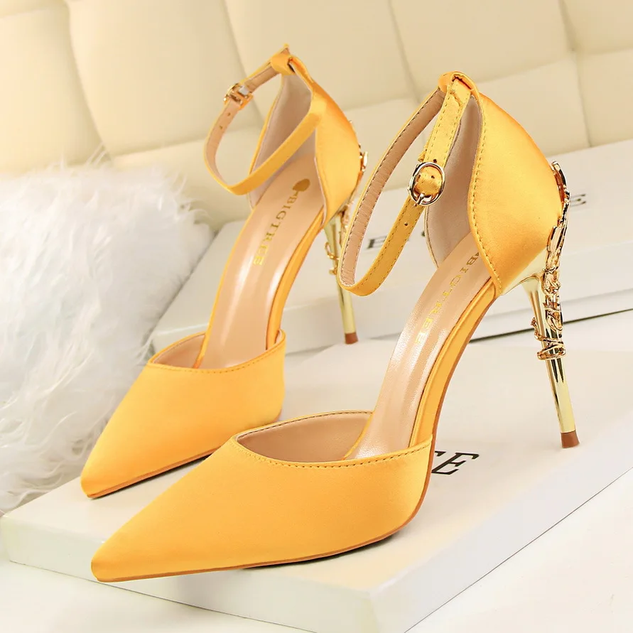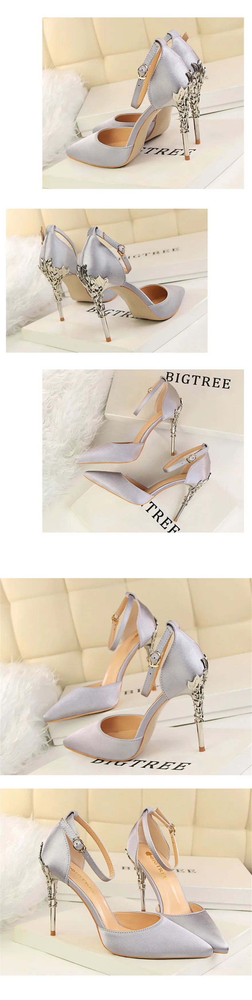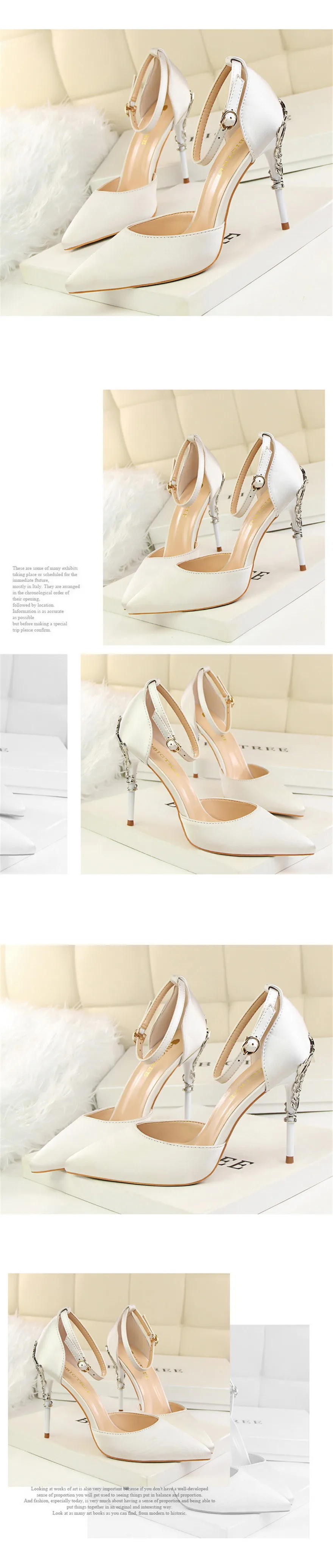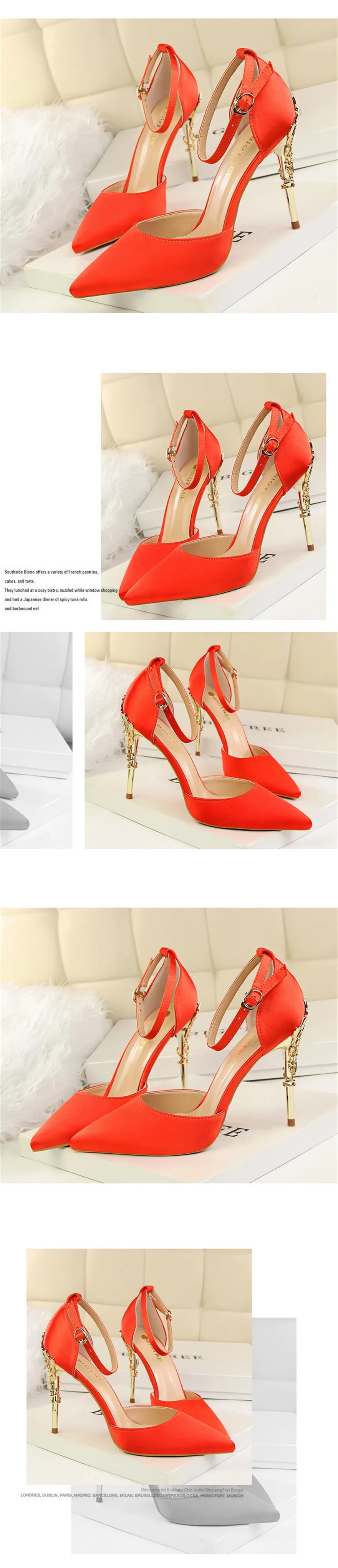 Item:Solid Silk Pointed Toe Buckle Shallow Women Carved Metal Heels Sandals