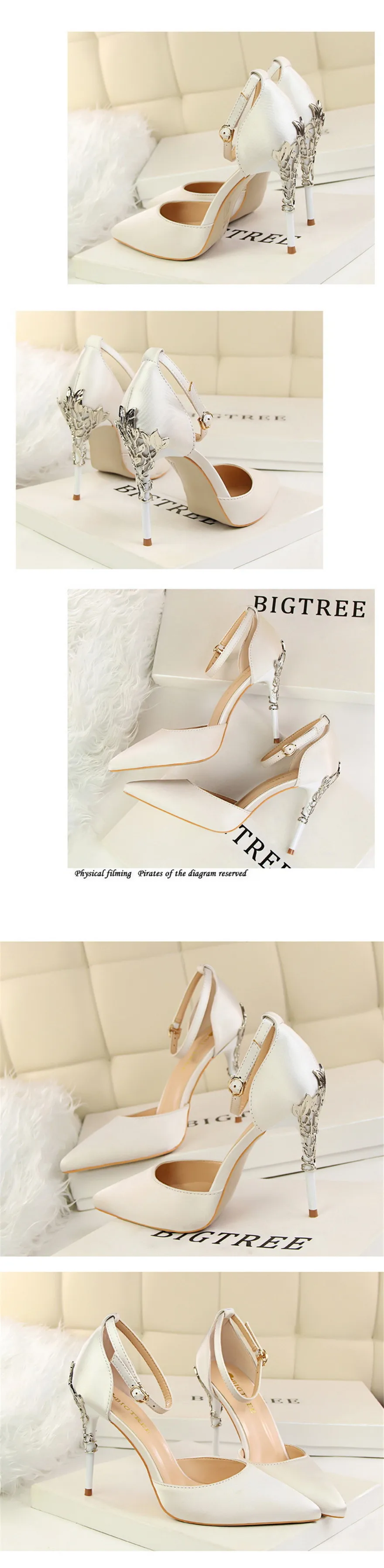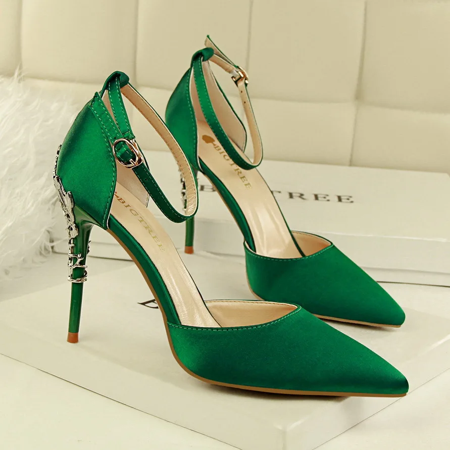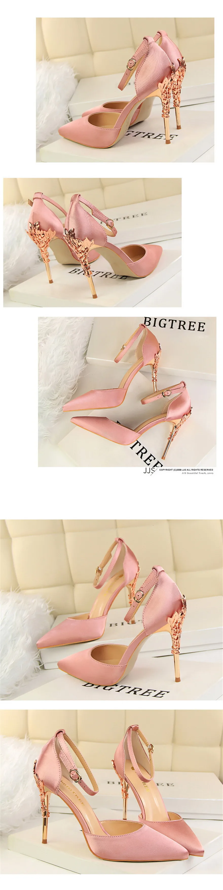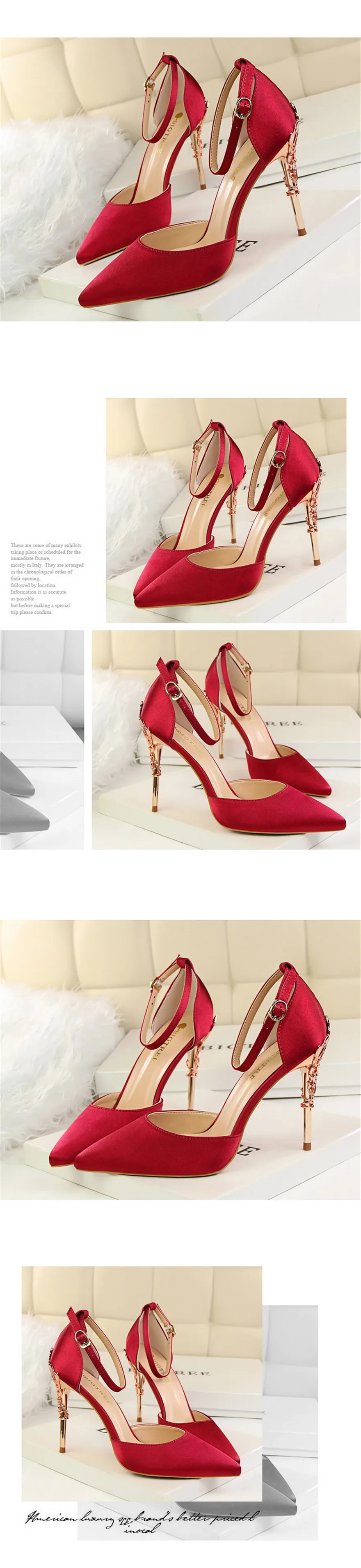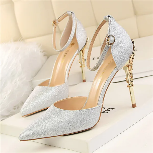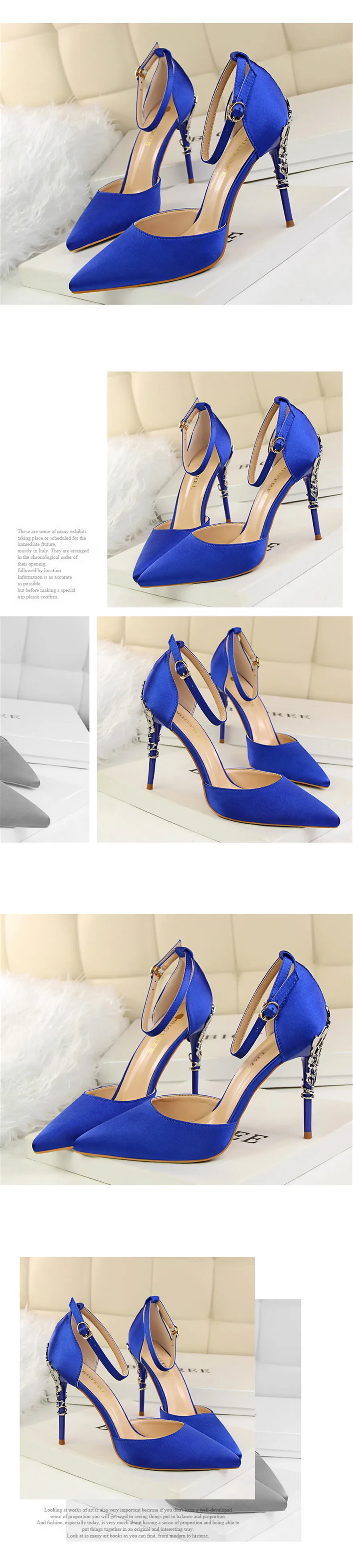 Item:Solid Silk Pointed Toe Buckle Shallow Women Carved Metal Heels Sandals
