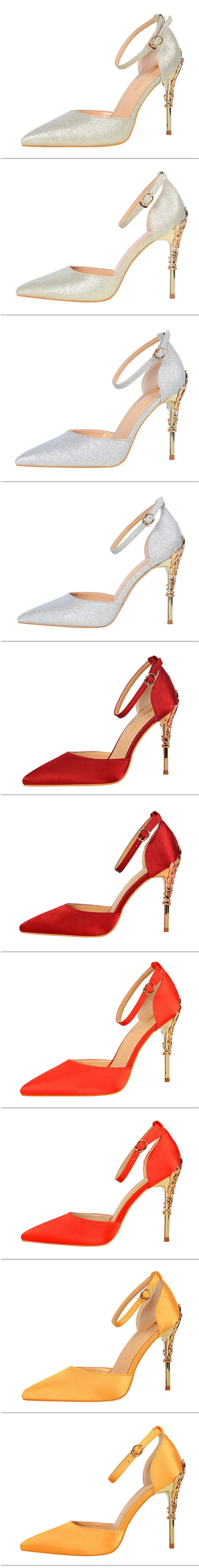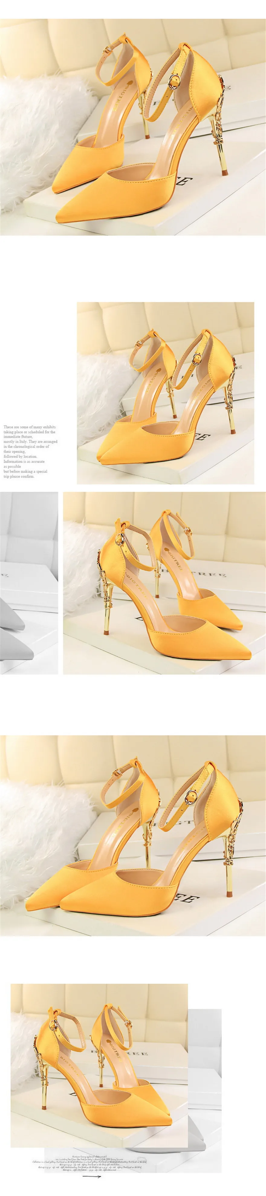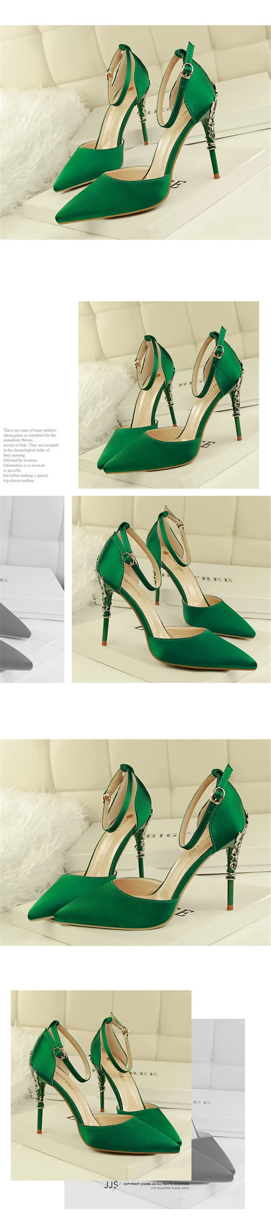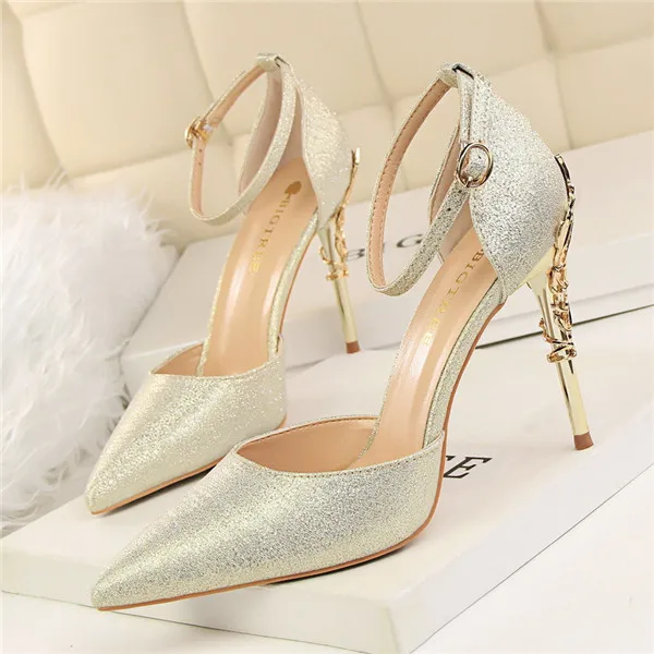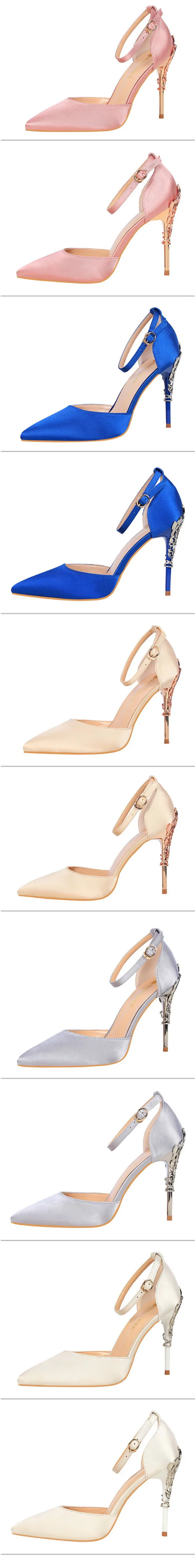 Item:Solid Silk Pointed Toe Buckle Shallow Women Carved Metal Heels Sandals