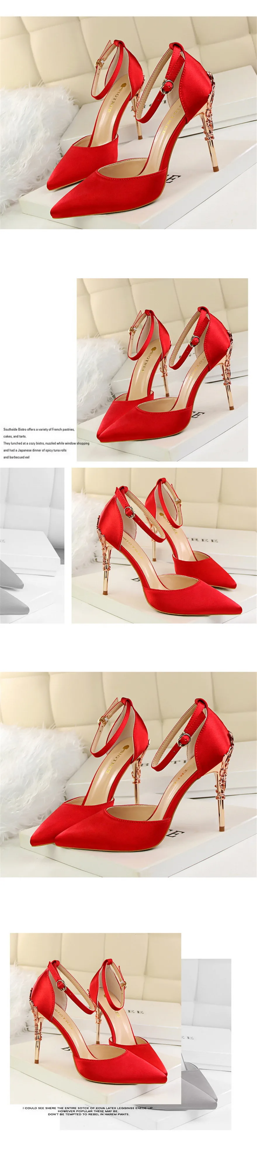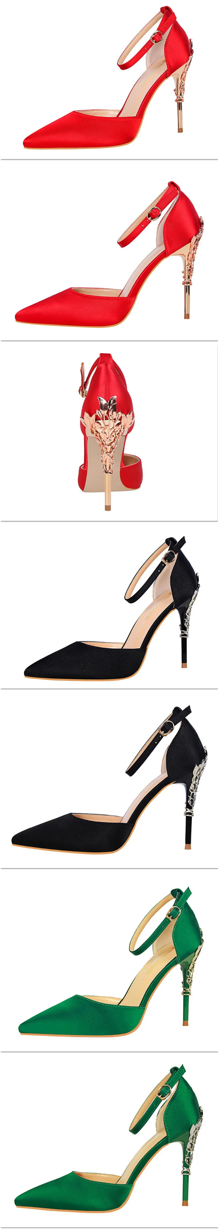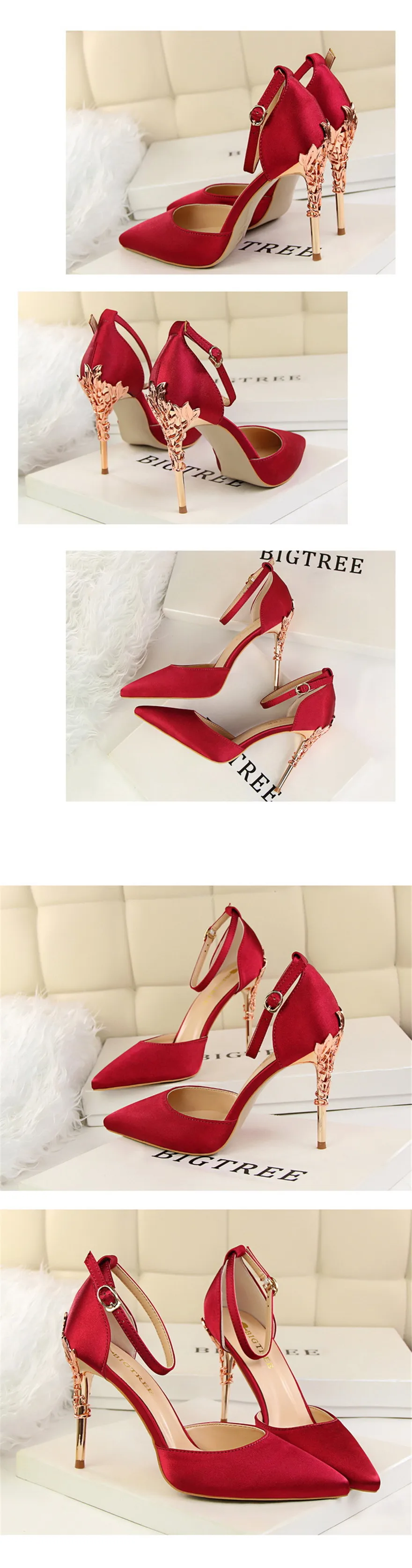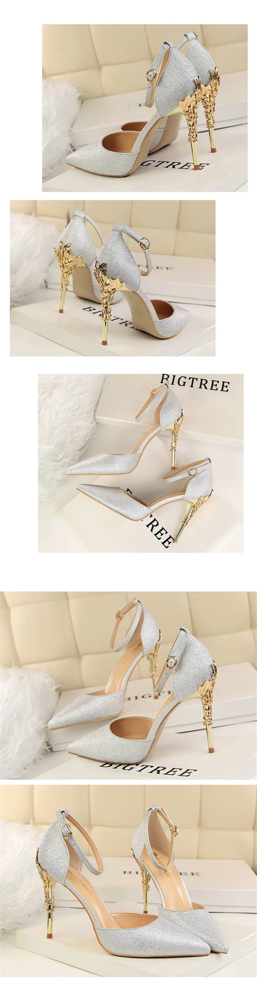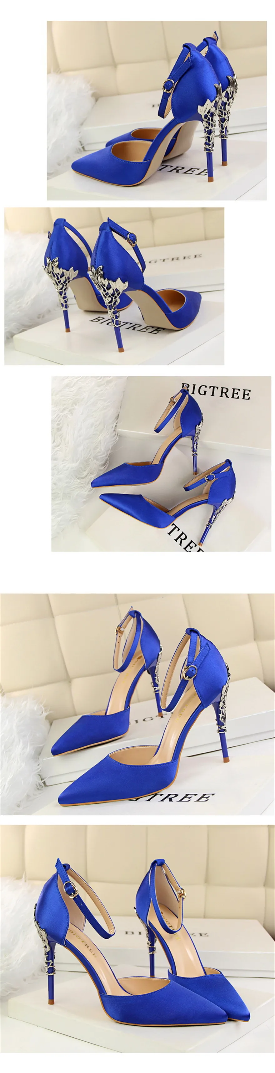 Item:Solid Silk Pointed Toe Buckle Shallow Women Carved Metal Heels Sandals
