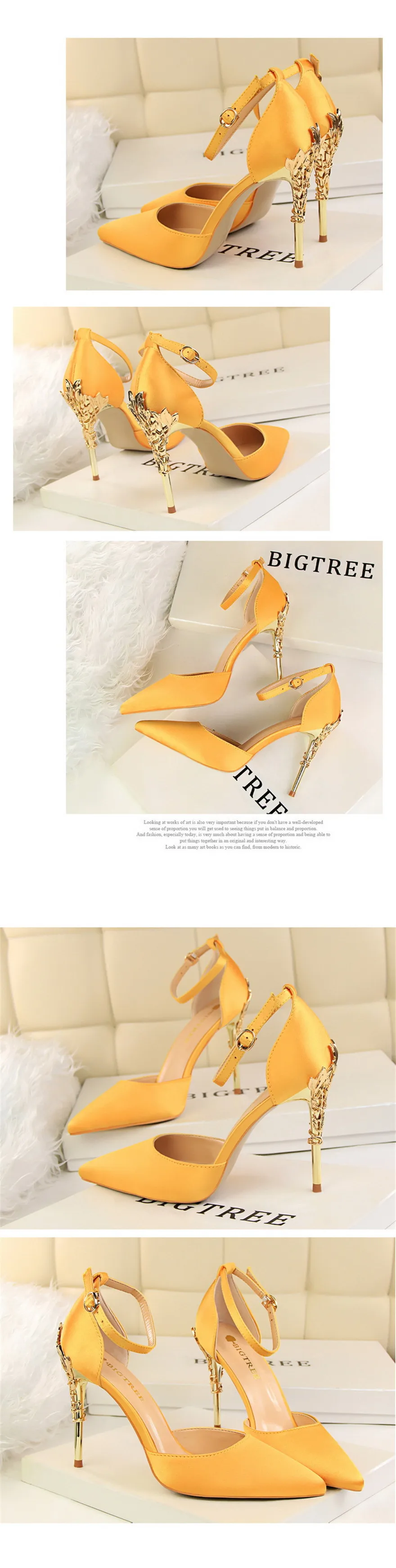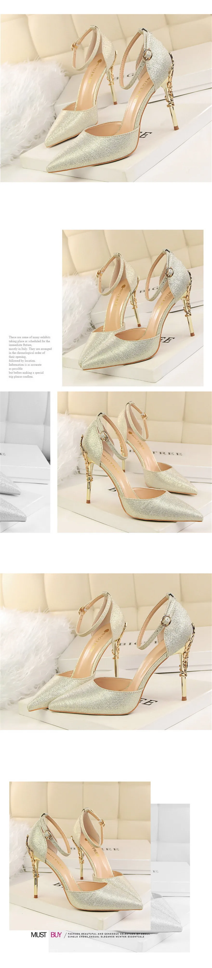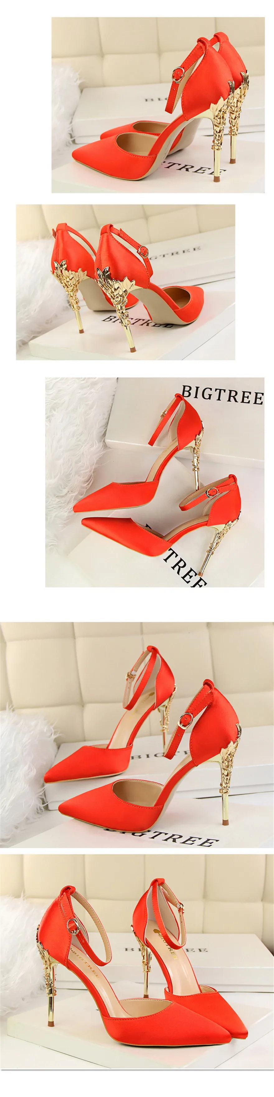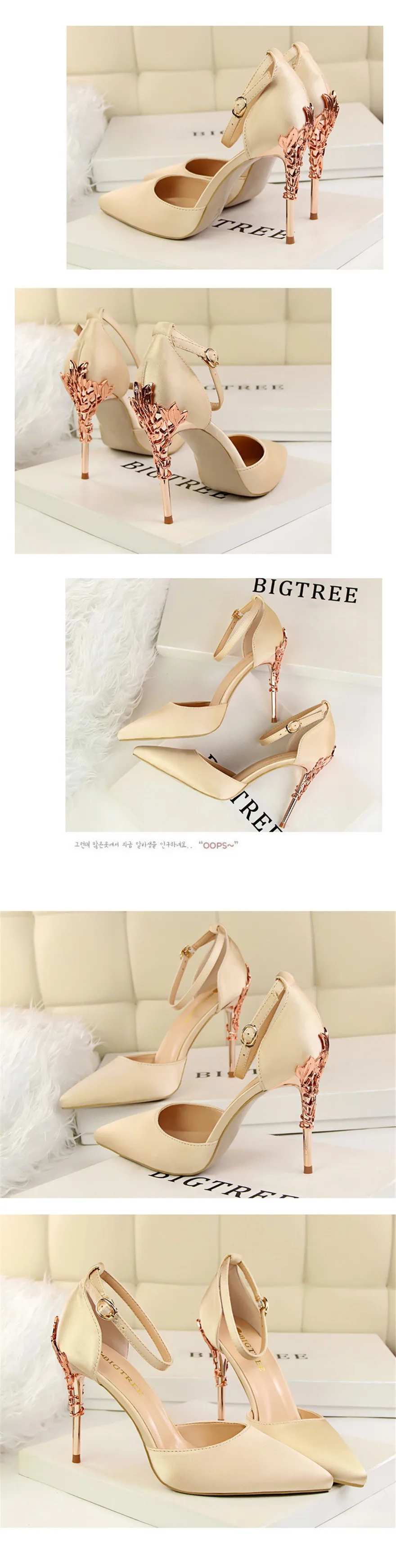 Item:Solid Silk Pointed Toe Buckle Shallow Women Carved Metal Heels Sandals