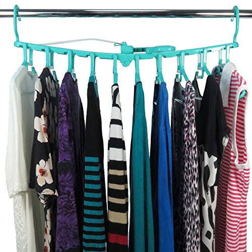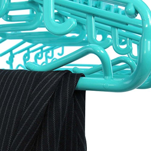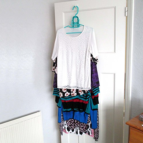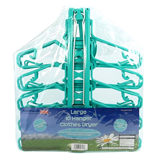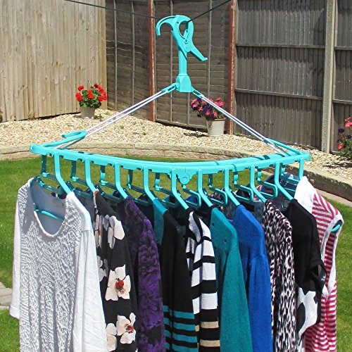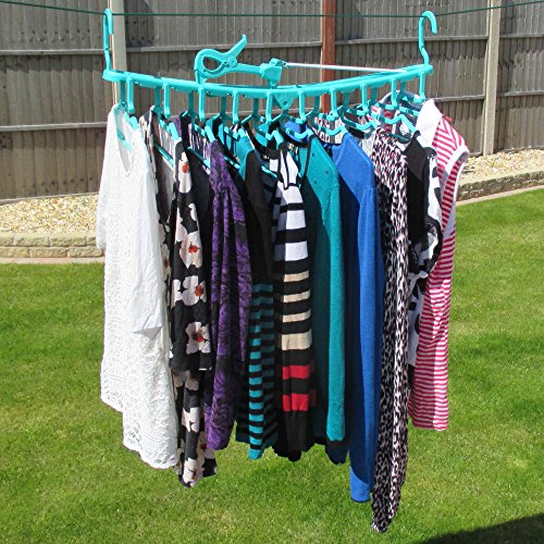 -. Feature : Make drying laundry easier with this premium quality multi-hanger/dryer from Hangerworld. Plastic turquoise frame with 10 all purpose integrated clothes hangers for smart indoor and outdoor drying. / Versatile central windproof hanging hook plus end hooks which allow full width or space saving drop down hanging. / Clips easily to washing lines, towel rails, wall hooks, closet doors and much more. Hang in drop-down position on the back of door for space saving storage. / Clever easy load cut out neck for t-shirts. Side trouser grips and loop hooks make this perfect for trousers, skirts and dresses too. Smooth round edged hangers help keep clothes in shape whilst drying & storing. / Neatly folds away after use. Perfect for caravanning, camping and travelling too. Size: Length 87cm (34") x Height 42.5cm (16.7") x Hanger Width 38cm (15") approx.
