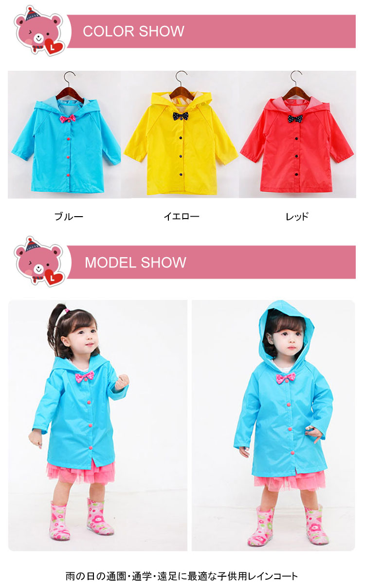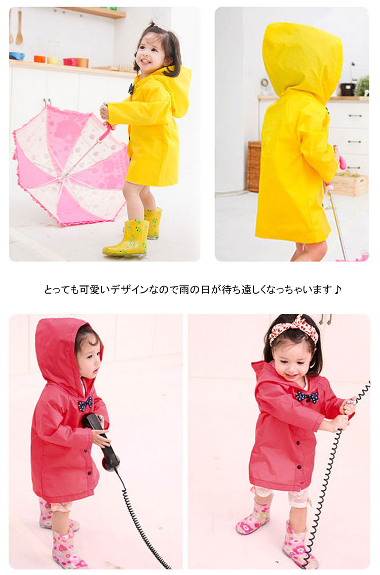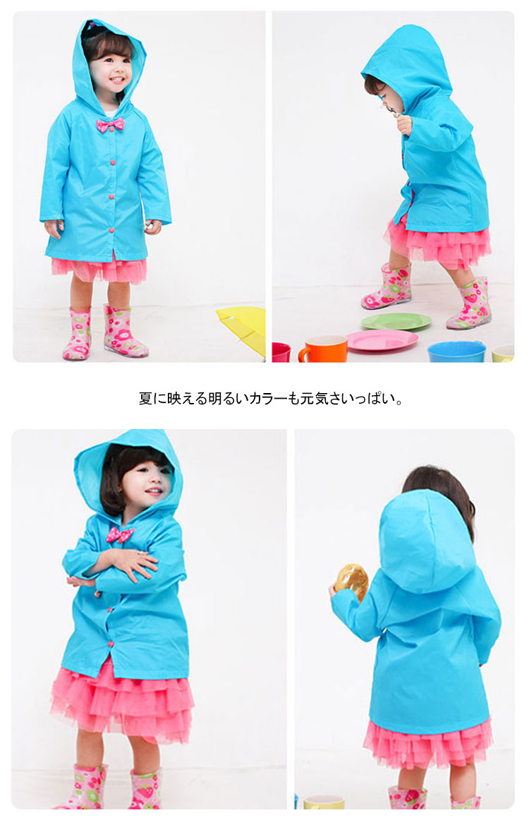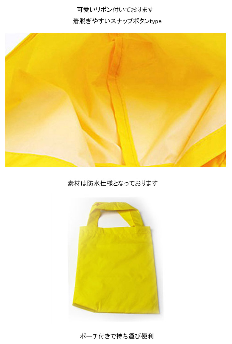 | 雨の日の通園・通学・遠足に最適な子供用レインコート夏に映える明るいカラーも元気さいっぱい。素材は防水仕様となっております。ポーチ付でコンパクトに持ち運びも便利。とっても可愛いデザインなので雨の日が待ち遠しくなっちゃいます♪ | |