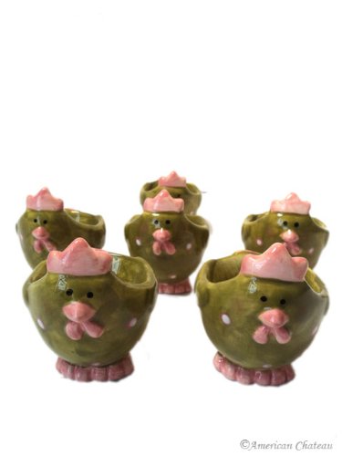 -. Feature : Set of 6 Egg Cups / Green w/ Pink Polka Dots / High Gloss Finish / Ceramic Construction / Approximate Dimensions: 3" H x 3" w x 2.5" D