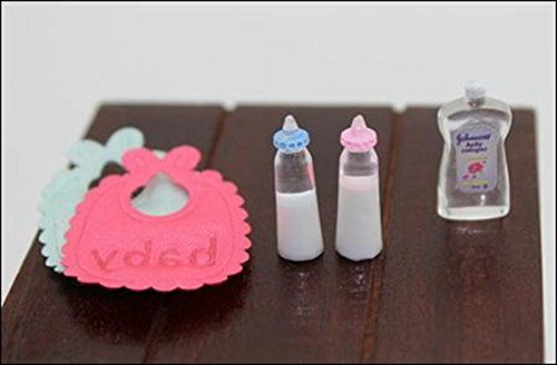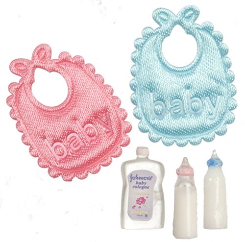 Studio : Miniatures World Publisher : Miniatures World Binding : Toy Product Description Set of Baby Accessories by Miniatures World.? Designed for the 1:12 scale miniature setting.? Made of fabric and resin.? Set includes 2 baby bibs,? 2 bottles of milk, a nd 1 bottle of baby oil.? Measurements : Baby Bib - 1? 1/8 inches tall x 15/16 of an inch wide.? Baby Bottle of Milk - 3/4 of an inch tall x 7/32 of an inch wide in diameter.? Baby Oil Bottle - 13/16 of an inch tall x 3/8 of an inch wide x 1/8 of an inch deep.