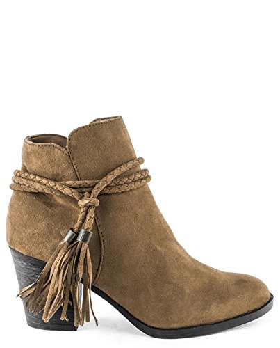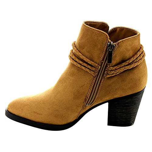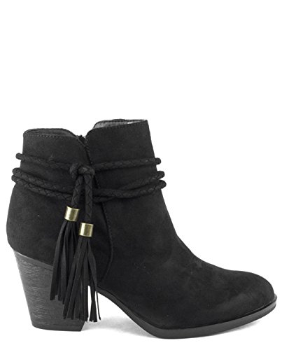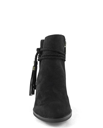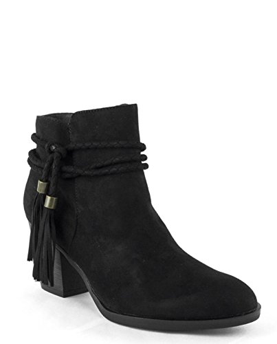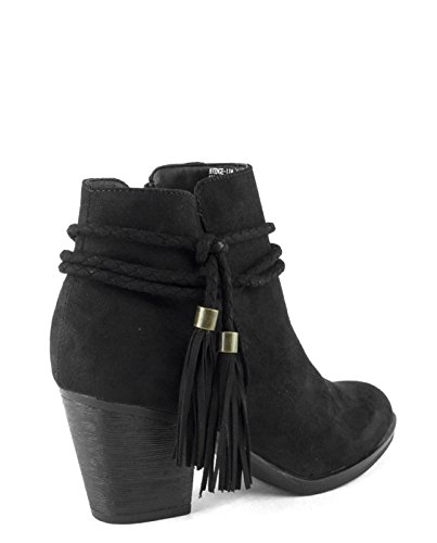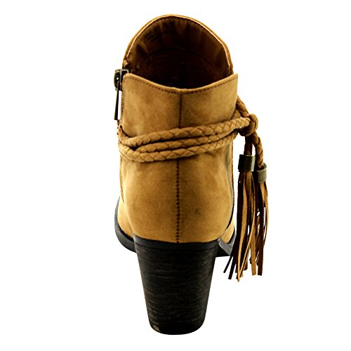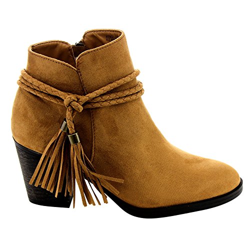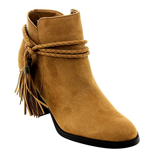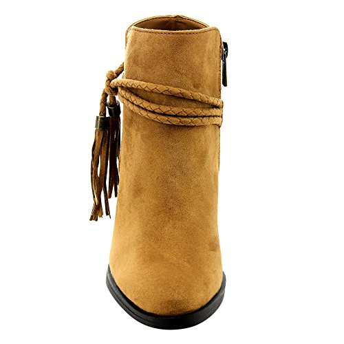 Binding : Apparel Product Description Walk in fashion and comfort in these ankle high heel booties are featuring a round toe, a braided design with hagging tassels, and a side zipper for easy wear and closure, finished with a high stacked chunky heel, it's perfect for your denim shorts. 0