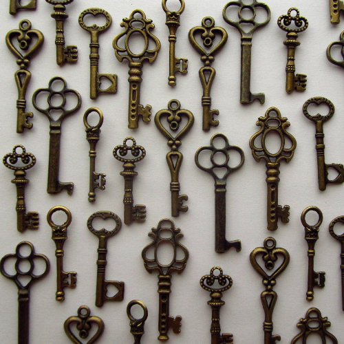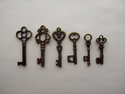 Salome Idea Skeleton Key Charm Set in Antique Bronze (48 Charms) 6 Different Styles - Vintage Style Key Charms (Bronze Color)