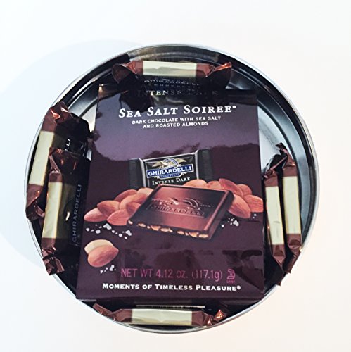 -. Feature : A 6.75 inch dia tin is filled with (1) 4.12 of bag of Ghirardelli Dark Chocolate Sea Salt Soiree Tasting Squares and (6) .53 ounce Ghirardelli Chocolate and Caramel Tasting Squares and is tied with a sophisticated black bow. / A great gift for men, women, couples or the whole family or office / Suitable for any occasion or holiday including Halloween, Thanksgiving, Christmas, New Years, Thank You & Appreciation, Corporate Giving, Birthday