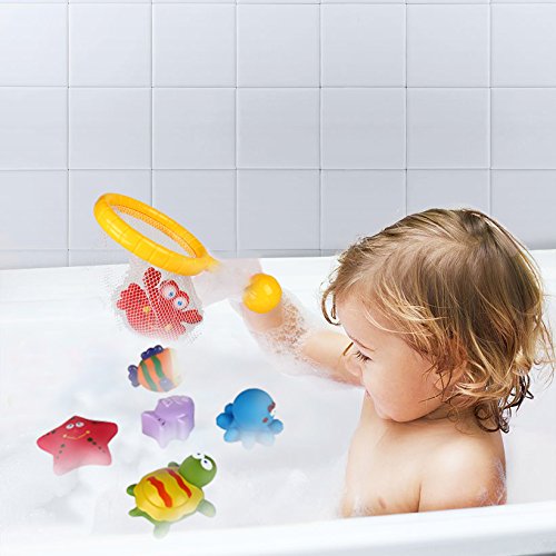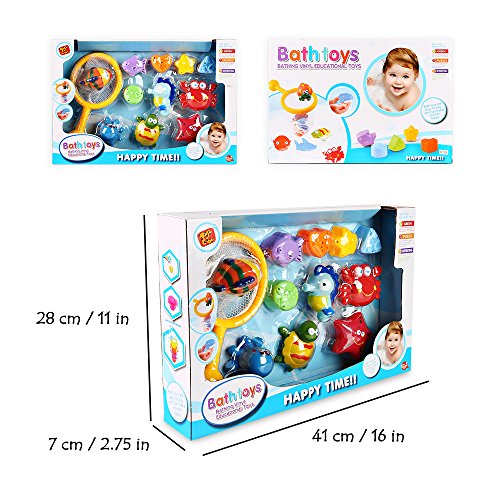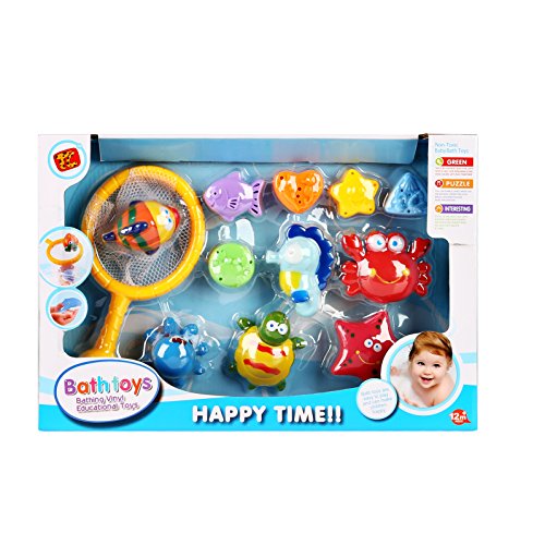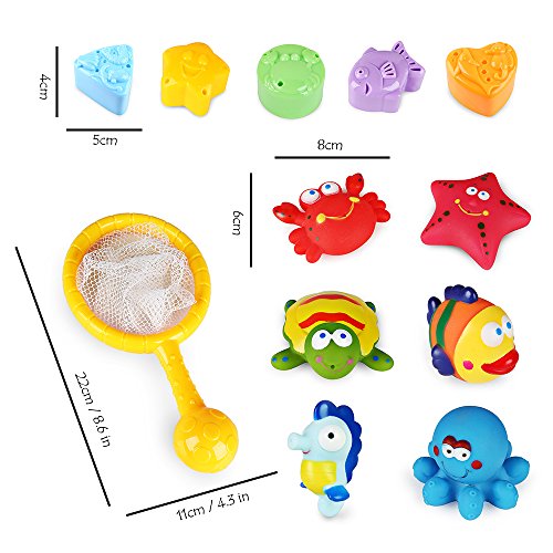 【12 Pieces 】Includes one fishing net and 11 different squirty animals in designs in various bright colours. Children can fish in the bath tub!