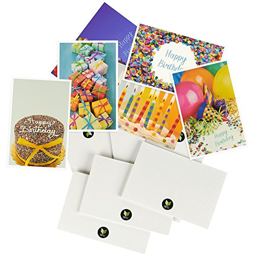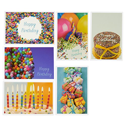 This assorted pack of 48 birthday greeting cards will prepare you for all your card-sending needs! Cut the hassle of rushing to the store and overpaying for cards. This pack contains 48 blank cards to include your custom messages for business and personal use. Each card features one of 6 colorful photos of birthday party supplies and elements. Make a statement with these birthday cards made of high-quality card stock that feels thick and sturdy. Each card measures at 4 x 6 inches and comes with corresponding envelopes. Make sure you have plenty of greeting cards on hand for when occasions arise.