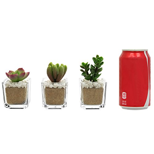 -. Binding : Kitchen -. Brand : MyGift -. Color : Clear -. Feature : A set of 3 assorted artificial succulent plants housed in modern clear glass vases. / Add natural-looking greenery of succulent plants into your space without the mess or maintenance. / Perfect for decorating any space in your home or office. / **Official MyGift® product.** / Approximate Dimensions (in inches): Overall - 2 W X 4 H X 2 D. -. IsAutographed : 0 -. Label : MyGift -. Manufacturer : MyGift -. MPN : TB-DECO0696CLR -. NumberOfItems : 3 -. PartNumber : TB-DECO0696CLR -. ProductGroup : Home -. ProductTypeName : HOME -. Publisher : MyGift -. Studio : MyGift -. Title : Set of 3 Modern Home Decor Mini Artificial Succulent Plants Potted in Glass Cube-Shaped Vase