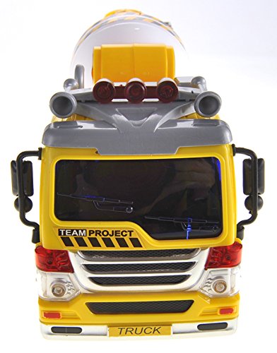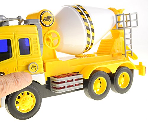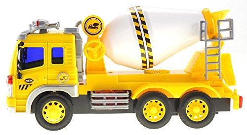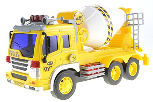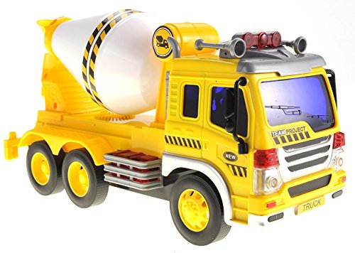 Watch your child have endless fun with this mixer truck toy. Let turn the handle and watch the mix spin and spin. Press the button the on the side of the truck to trigger the lights and sounds. This truck is beautifully detailed and comes in a very bright yellow color! The friction power motor is simple to use, just pull back and watch the vehicle go forward. - cement truck - toy trucks - kids cement mixerFeature