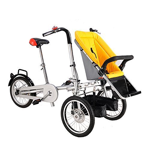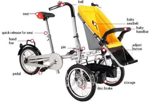 -. Feature : This Bike Stroller is a multifunctional vehicle designed for families on the go. It is a baby stroller and carrier bike all rolled into one. In seconds, this mother bike goes from super fun, safe and maneuverable bicycle to designer stroller that easily navigates stores, boards trains and slides into elevators. / This bike stroller is a good choice for you to go outside and enjoy leisure time with your child. It is not only a way for you to exercise, but also a way to strengthen your relationship with your child. / This bike stroller is foldable and can be put in trunk. Before folding the bike, you should remove the baby seat first / It is more stable than traditional bike because it has three wheels. Thus it is easy for you to control the direction even if you cannot ride a bicycle / You can enjoy leisurely, fun, and safe bike rides with your child, and then convert the bike to a stroller and hop right onto the bus or into the grocery store. When you're done shopping, convert the stroller back and pedal your groceries home! In bike mode, the Bike & Stroller is a tall, sturdy tricycle, with 16" quick-release wheels.