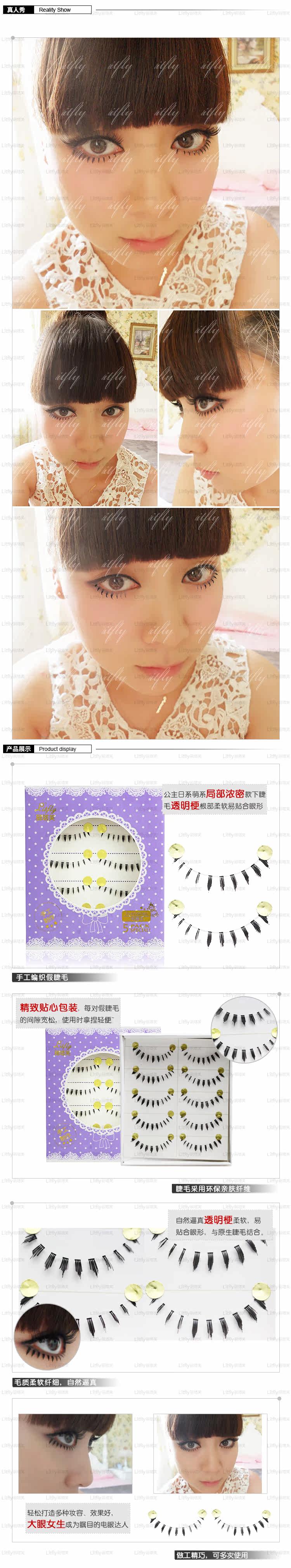 精巧做工可使用3~5次。纤细的假睫毛与自身真睫毛的混合。配合不同色系的眼影及妆容不会有夸张的感觉,是出席PARTY、演出艺员、生活妆、个性妆的好搭档