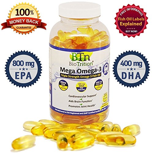 -. Binding : Health and Beauty -. Brand : BioTrition -. EAN : 0852172006089 -. Feature : REAL REVIEWS. Our reviewers are never paid or compensated in any way. Only real reviews from real customers. / TOP QUALITY... EVERY TIME. We own our own facilities. That means we not only control quality and safety from start to finish, but we contol the consistent quality from batch to batch. There are no sudden bad batches that get passed down to you. / PREMIUM INGREDIENTS ONLY. We beleive that great, effective supplements can ONLY be built from quality ingredients. The gelatin we use protects against oxidization and is both Kosher and Halal Certified, and we only use top quality ingredients. Premium FRESH oil (Halal Certified) means no rancid oil and no fish burps! Just a pleasant hint of lemon if you do burp at all. / FULL DAY'S NUTRIENTS IN A SINGLE DOSE. Mega Omega-3 contains the full amount of the recommended daily value for Omega 3's in a single dose when added to your regular diet. / 100% MONEY BACK GUARANTEE. Unhappy for any reason? Just get in contact with us and we will happily and quickly resolve the issue or give you your money back! -. IsAdultProduct : 0 -. Label : BioTrition -. Manufacturer : BioTrition -. PackageQuantity : 1 -. ProductGroup : Health and Beauty -. ProductTypeName : HEALTH_PERSONAL_CARE -. Publisher : BioTrition -. Studio : BioTrition -. Title : Omega 3 Fish Oil 800mg EPA 400mg DHA 200 Burpless Supplements Pills BioTrition Mega Omega-3 with Great Lemon Flavor Doctor Recommended for Rheumatoid Arthritis Inflammation Certified Kosher Halal Gel -. UPC : 852172006089