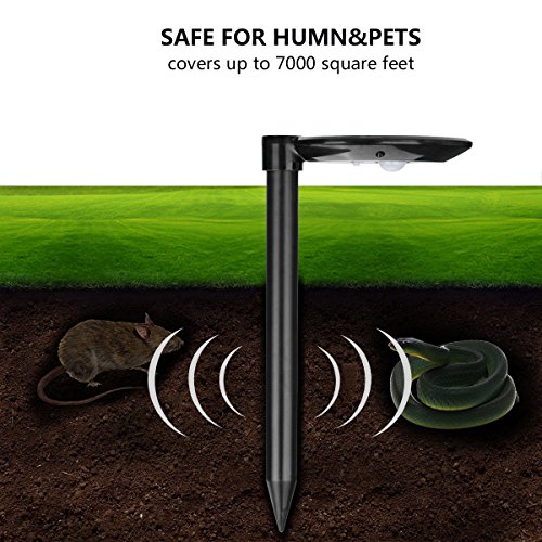 BEST UPGRADE VERSION REPEL: Send out a burst of sonic waves in every 25 seconds,that can drive away moles, voles, mice and rats within about 6900 sq.ft [UPGRADE VERSION], build a safer place for your Garden Yard Lawn Farm. This device will effectively repel Snakes Moles Gophers Rodents Rats Raccouns Voles sheltering in the area.First to test the funtion it will sound like“DI----”,second “DI DI DI”then Third “DI DI DI DI”then it will repeat“DI----”