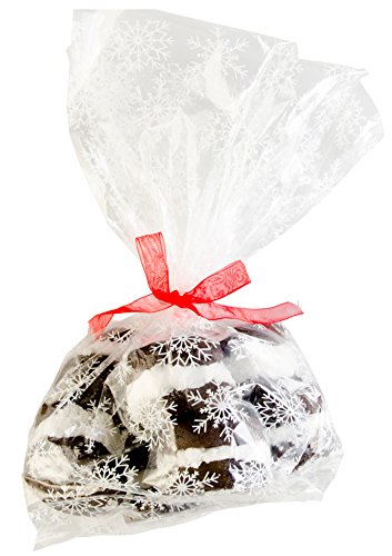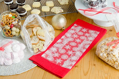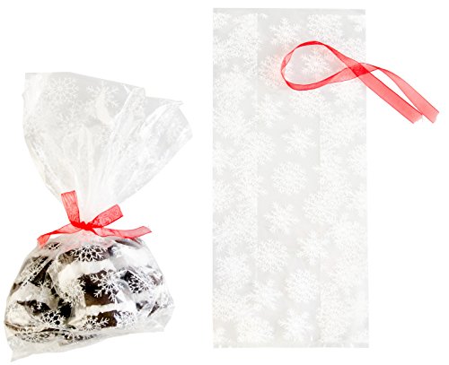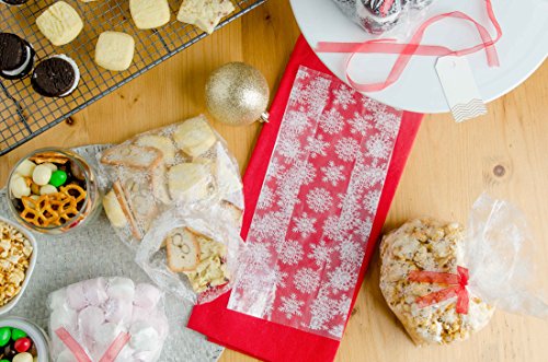 - CELLOPHANE TREAT BAGS, PERFECT FOR GIFTING HOLIDAY COOKIES OR PARTY FAVORS: These clear cellophane cookie bags/ party favor bags are printed with a delicate white snowflake design, and come with pretty red ribbons for tying around your home-made gifts.