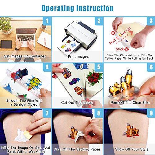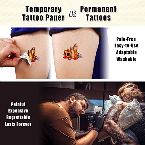 Studio : Bundle Monster Publisher : Bundle Monster Binding : Misc. Product Description Wait! Before you put that needle to your skin, we've got an alternative! Skip the pain and regret; Rory Tory's Temporary Tattoo Paper for Inkjet Printers lets you tattoo any design you want. This set comes with 4 sheets of A4 sized (11.7 x 8.3 in) water transfer printable tattoo papers that are compatible with inkjet printers and 4 sheets of A4 sized adhesive papers, so you'll be able to create hundreds of custom designed tattoos with any of your favorite pictures or designs. Each sheet fits most standard inkjet printer trays for easy printing. Tattoo pictures of your pets, your favorite sports team logo, and even your girlfriend's name without the embarrassment or regret. Use these papers to plan or test the placement, size, and design of your body art before making the jump to a permanent tattoo. Make tons of designs and DIY party favors for your next event or party. Print out spooky special effect designs for easy Halloween costumes. Change up your designs for any occasion! These fun tattoo papers are great for DIY projects or as a fun interactive activity with kids. Perfect for birthday parties, weddings, sports events, school projects, cosplay, Halloween, Christmas stocking stuffers, Easter baskets, concerts, festivals, sleepovers, and more. Our printable temporary tattoo paper is made with non-toxic materials to prevent harm to your skin. Every removable tattoo is waterproof, sweatproof, and lasts up to 3-5 days with gentle care. No need to dish out hundreds of dollars for laser removal; taking your tattoo off is easy! Just saturate it with baby oil or warm soapy water for 10 seconds, then rub gently with a cotton ball. (Repeat if necessary.) Water slide decal tattoo papers are a cheap and easy way to add a personalized touch to any get together. Boys or girls; kids, teens, or adults will love these long-lasting temporary tattoos and will provide hours of fun for everyone. Choose between Laser Inkjet compatibility options! 0