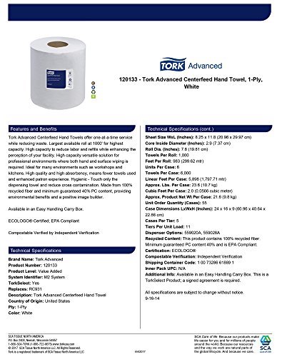 -. Title : Tork Advanced 120133 Centerfeed Hand Towel, 1-Ply, 8.25" Width x 11.8" Length, White (Case of 6 Rolls, 1,000 per Roll, 6,000 Towels) For use with Tork 559020A or 559028A