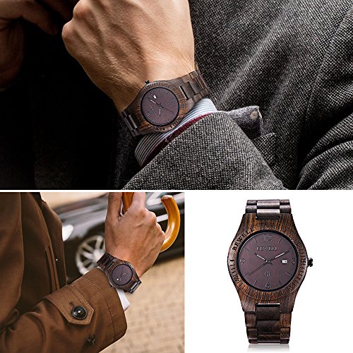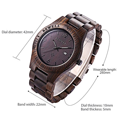 [Description] Special Features:Made of 100% natural wood from Africa. Each one is hand-crafted. Unique and eco-friendly. Maybe the natural colors of them are slightly different from each other and color difference. Wood Material Features:It is light weight and comfortable to wear. The wood band is smooth and feels nice.Casual and Retro style which is unique and cool. Wearing Features:You can easy to resize the watchband to fit your wrist. It comes with the watch box_you can keep it clean and dry in the box. Try NOT to get wet or soak in the water in daily life. How to remove watch links:1:Adjust needle aim at the side hole 2:Stand the watch 3:use a little hammer to knock the needle 4:Take off the watch link needle 5:Take off links 6:Brought the band back and press out. Gift Idea:Wooden Watch is a great gift choice to your loved ones for Christmas_ birthday_ anniversary_ Father``s Day_ graduation or Valentine``s Day.
