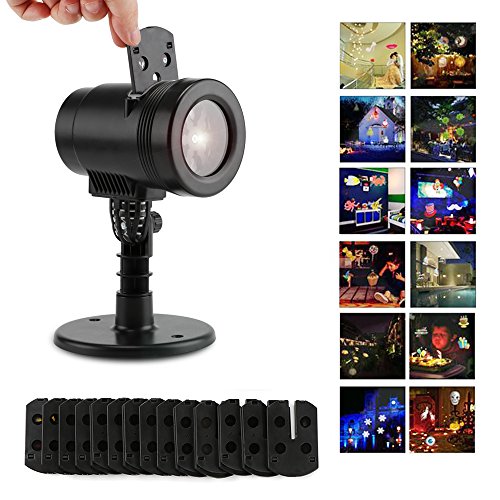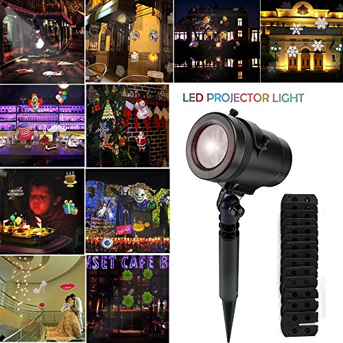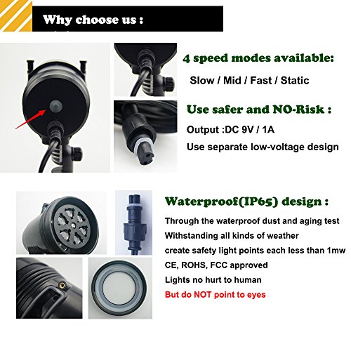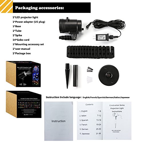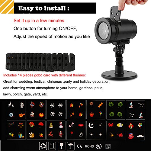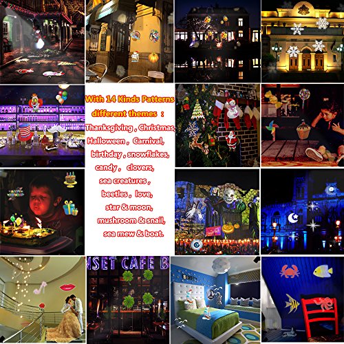 -. Feature : 14PCS Decorative Lighting : Thanksgiving, Christmas, Halloween, Carnival, birthday, snowflakes, candy, clovers, sea creatures, beetles, love, star & moon, mushroom & snail, sea mew & boat. / Auto Rotating Lighting Effect : with the movement Projection show ,all pattern is very beautiful.Just insert gobo card into slot and adjust the mounting bracket for a suitable lighting angle will ba an good atmosphere and create more fun for your party, house and garden. / Easy to install/IP65 waterproof : set it up in a few minutes. One button for turning ON/OFF, adjust the speed of motion as you like. Round base and ground stake included for hassle-free indoor/outdoor set-up. Even in rainy days or freezing cold nights, you can achieve the desired effect. / Safe to Use:CE, RoHS, UL Certification approved. No laser, no harm to eyes compared to laser projection lighting. Adopt professional 9W 4pcs high quality OSRAM LED beads which Max irradiation distance is up to 5m / 16.4ft. Up to 180 degrees lighting angle.DC 9V Low Voltage design,Energy saving and Low power consumption. Built-in smart timing function,4 speed modes available,satisfy your needs of the rhythm. / Use Occasion : Ideal for interior and exterior walls,landscapes,dance floors and more Celebration Series Projection Light Designs for every occasion! Create instant Warm atmosphere for Christmas, Halloween, weddings, family parties ect.