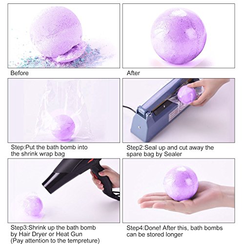 - EASY TO USE- Bath Bomb Mold is Great for beginners and more experienced crafters. This set contains a measure cup and a scraper. Complete with step-by-step directions in the product description & and These wrap films shrink up quickly with a heat gun or hair dryer and sealer