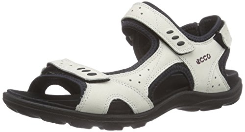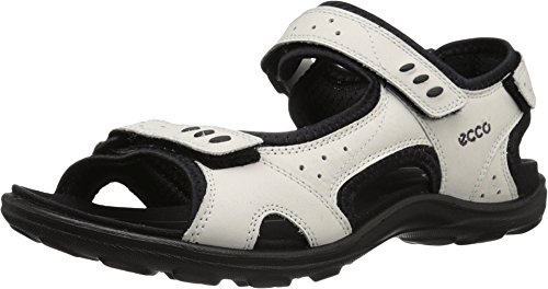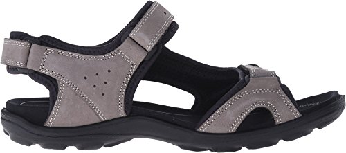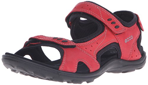 Sporty sandal featuring leather upper with fabric lining and adjustable hook-and-loop closures at counter, ankle, and toe