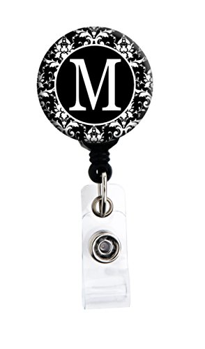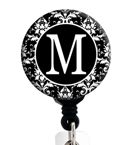 M Initial Black and White Damask - Retractable Badge Reel With Swivel Clip and Extra-Long 34 inch cord - Badge Holder