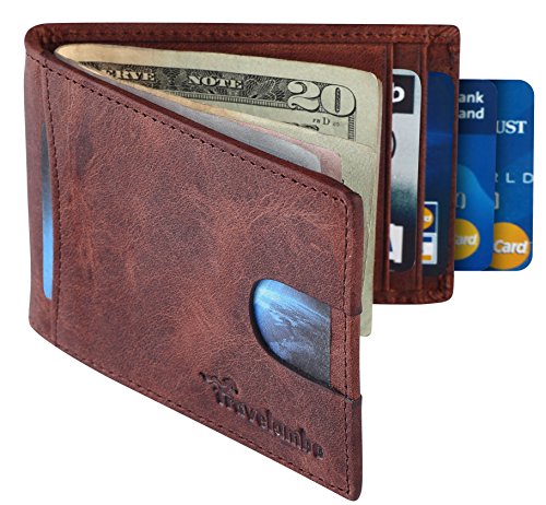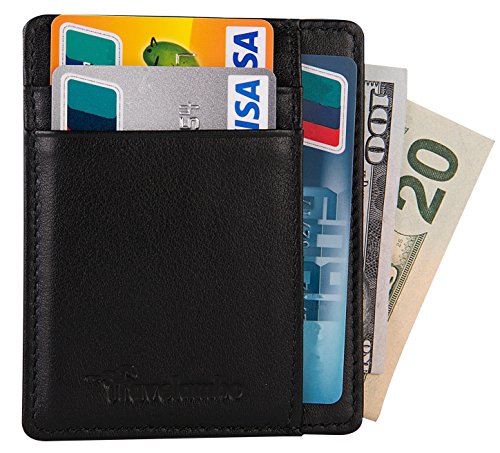 Slim, only 0.12" thick, sizing 3" X 4.25" X 0.12"; 100% genuine leather, soft and durable; RFID blocking for perfect protection of your personal and financial data in credit card and debit card; 7 slots in total for standard size cards; convenient to be carried around in your front pocket.