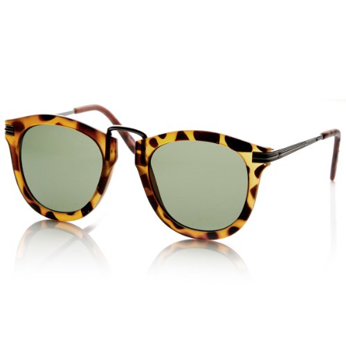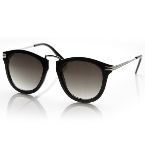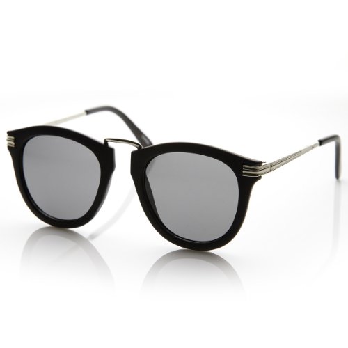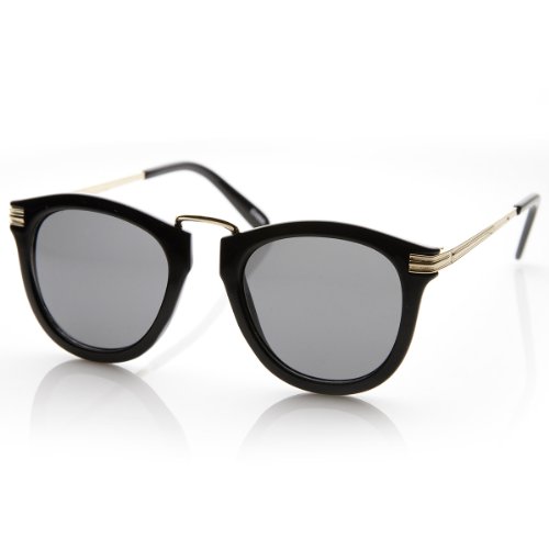 Designer inspired round p-3 shaped frame made from black acetate with a prominent metal nose bridge that projects in front of the frame. Features metal arms and metal hinges. Made with an acetate and polycarbonate UV protected lenses.