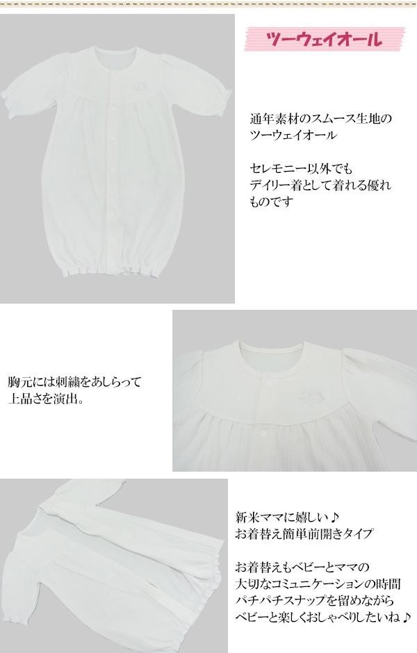 | 仕様 | 洗濯機使用可 乾燥機使用不可 着用月齢(目安):0~3カ月 【オーバードレス】総丈:57cm、身幅:30cm 【ツーウェイオール】総丈:50cm、身幅:25cm 【帽子】適応サイズ(頭まわり):50cm |