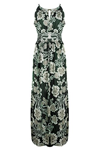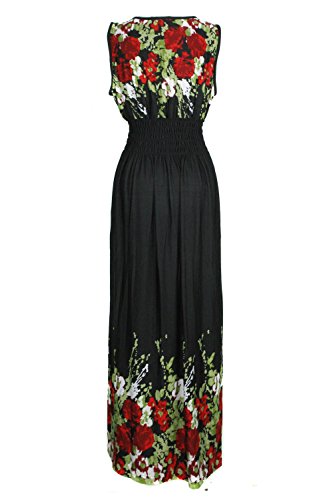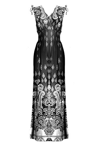 Sleeveless long smocked dress featuring a bohemian inspired bright bold printed pattern all throughout for the season. Surplice crossover v-neckline and a fitted smocked stretch construction defining the waistline. Ruched tie and smocked details at shoulders and a lengthy dress in a top quality medium weight jersey stretch knit for softness and comfort.Feature