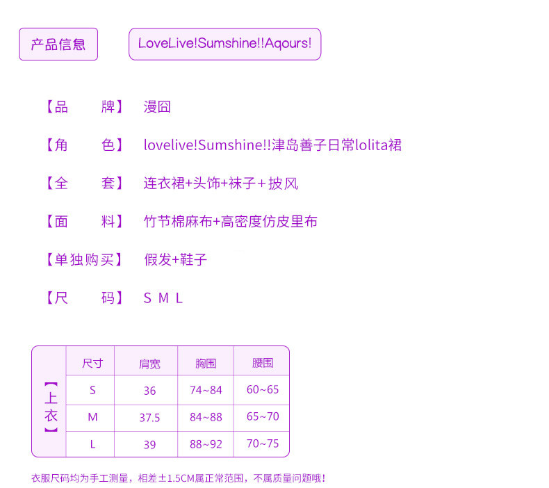 S: shoulder 36cm, chest 74-84cm, waist 60-65cm.
