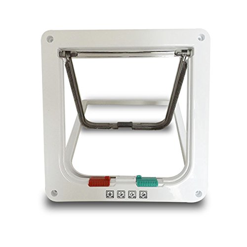 - This locking pet door, gives your cat or small dog the freedom to come and go without bothering you. - Locking doors can be set in 4 modes: swing out only, in only, both in and out, and fully locked. - Transparent flap lets you and your pet see what's on the other side of the door. - Easy to install; waterproof and tightly sealed to prevent energy loss, brush strip eliminates noise from the door closing.