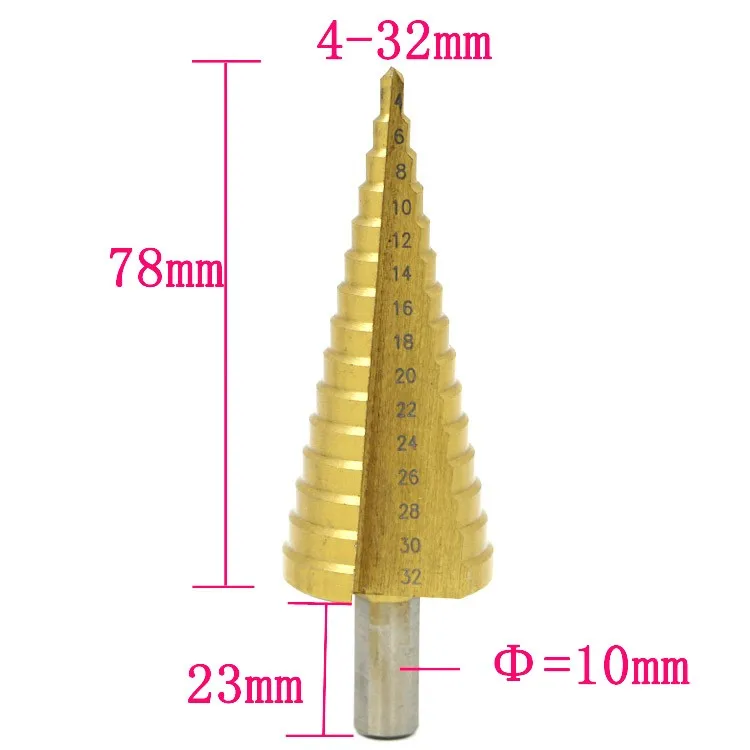 This is HSS High Speed Steel Step Drill / Pagoda Drill Bit, which is made from high quality HSS steel, and with the Titanium coated to reduce friction and heat.